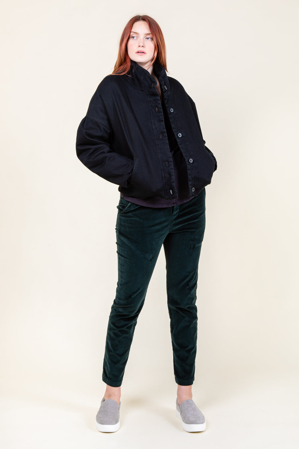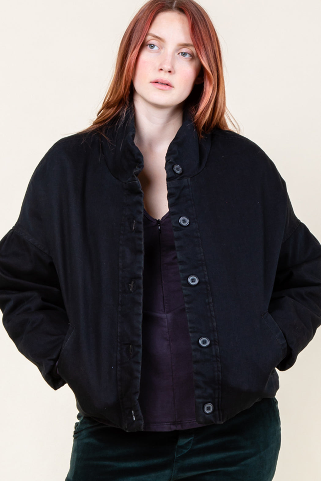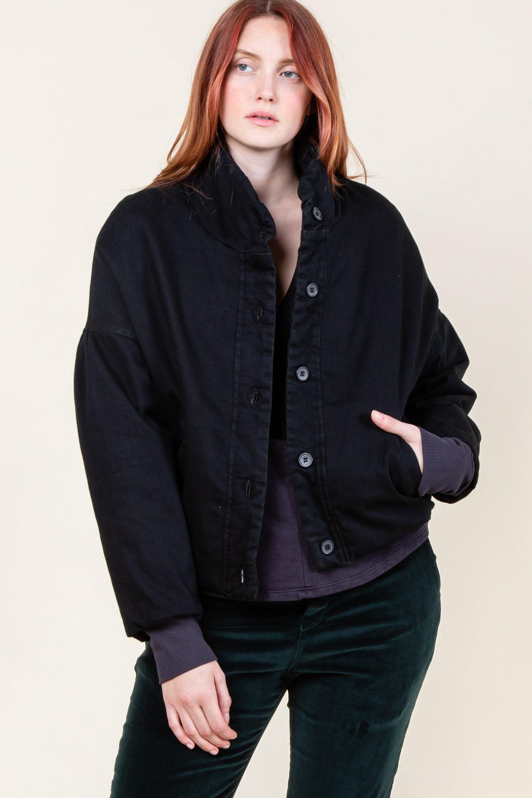 A cropped Bomber Silhouette in unusual, plant-based textiles. Capable of functioning like a blazer when worn all day over a t-shirt. All hems are shaped with elastic, a technique that creates weightless volume. Shoulder gathers are dropped to mid bicep for a cool, carefree feel. This shape looks great with baggy pants and is conceived to be gender neutral.