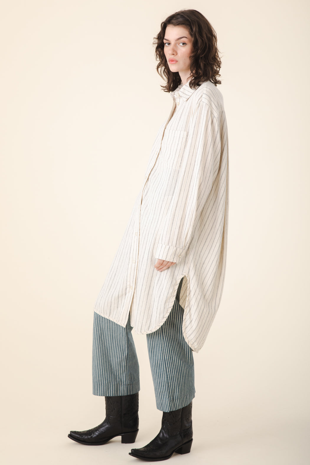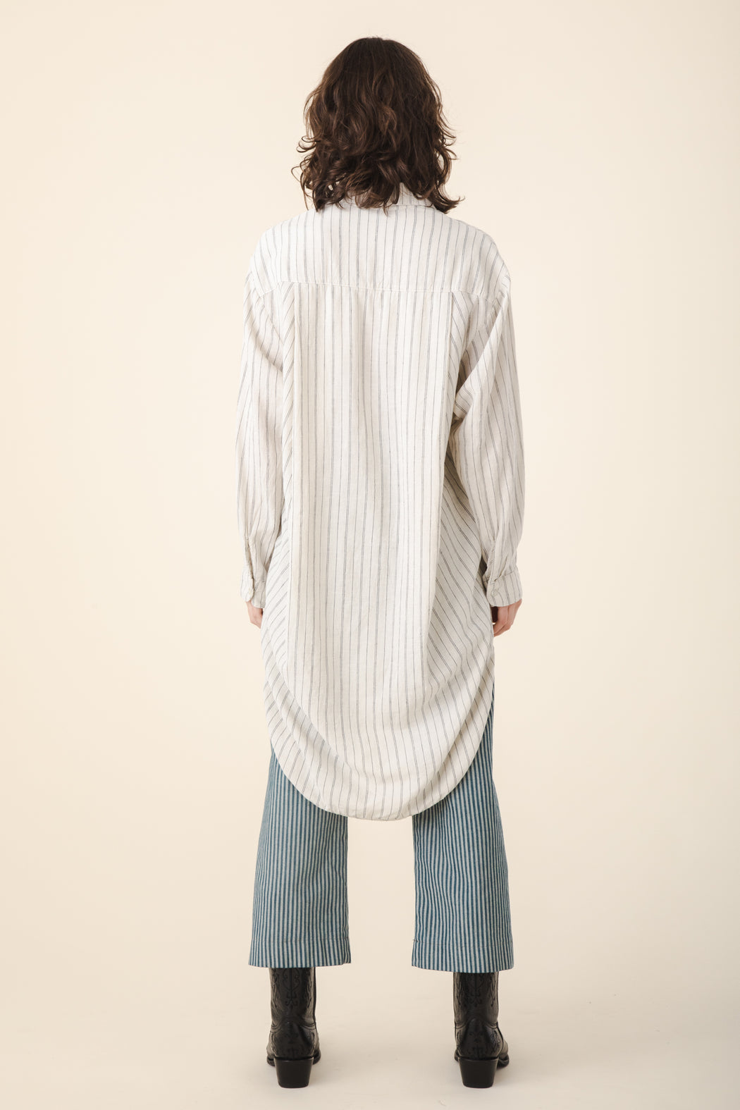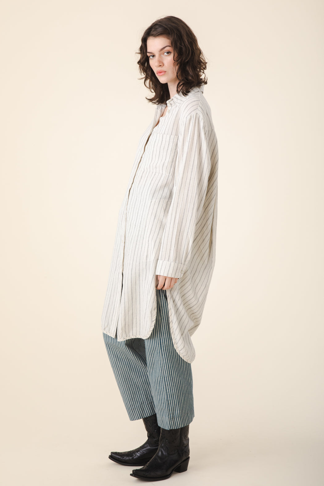 The Replica Shirtdress is back in our favorite Hemp and Organic Cotton stripe. Taking inspiration from a prêt-à-porter shirt, we have evolved our Replica Shirt in length, shape, and textile to function as a shirtdress. Deep pleats at the back yoke create volume and dimension. This billowy shirtdress is composed of quality, leftover textiles from previous collections.