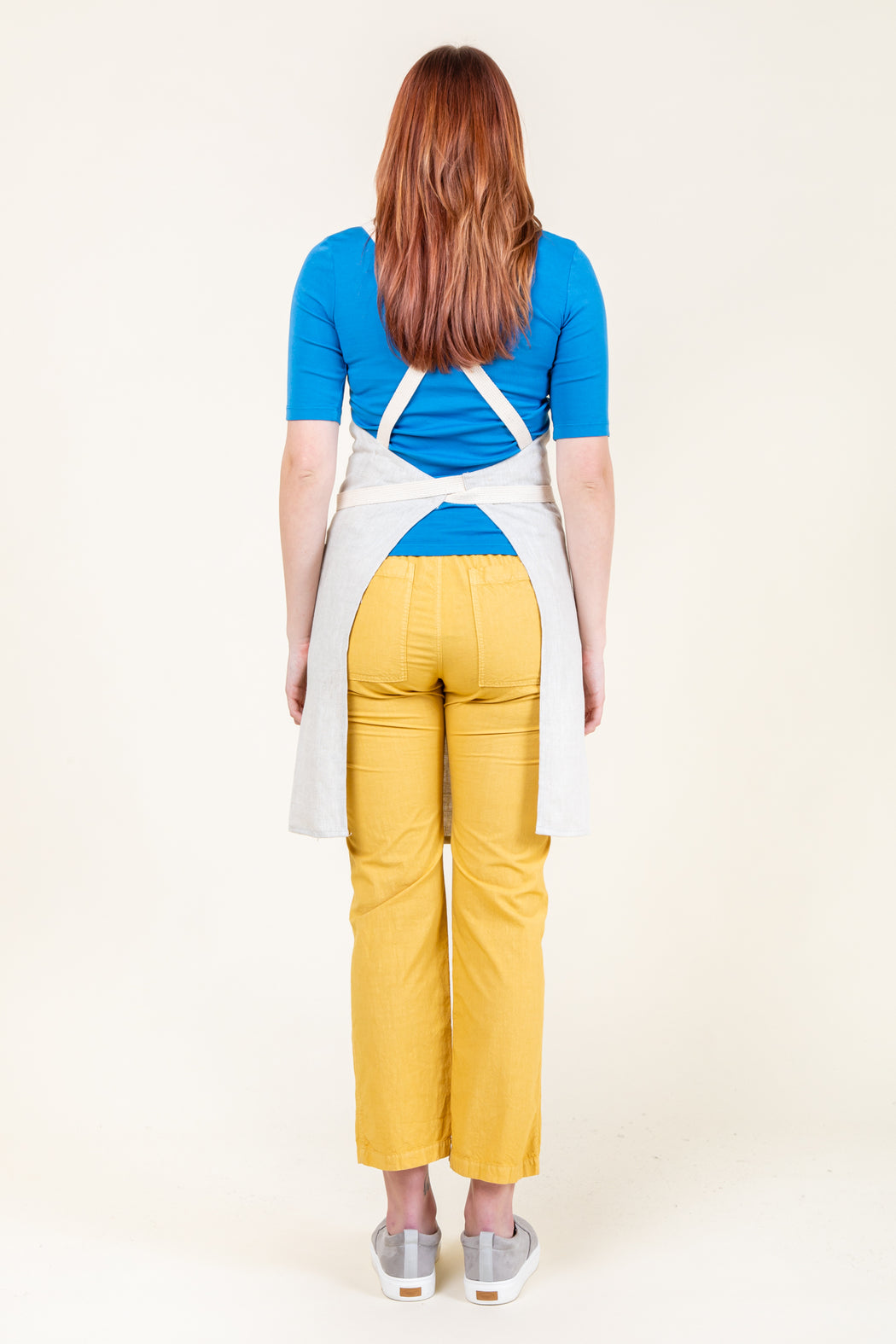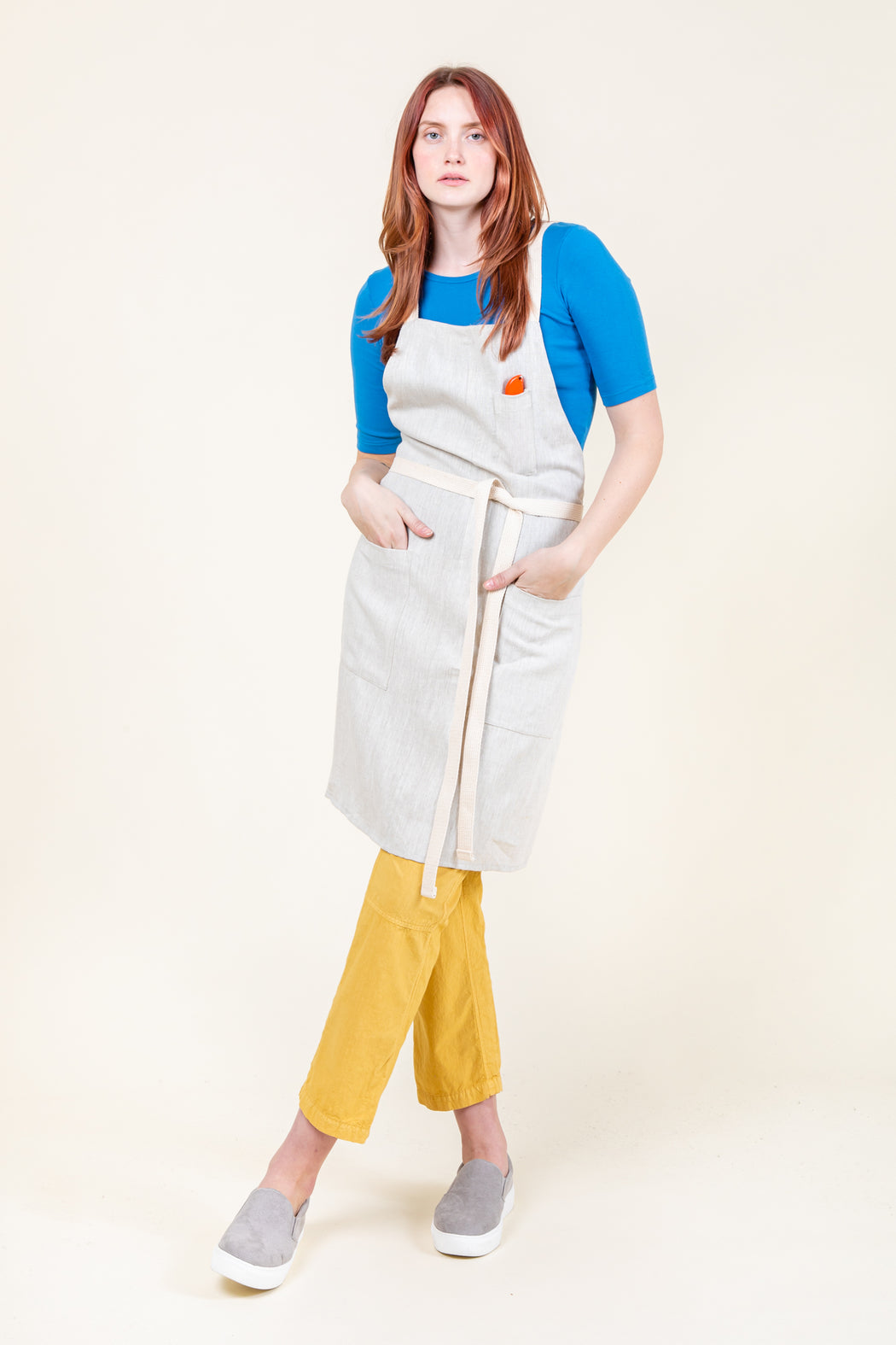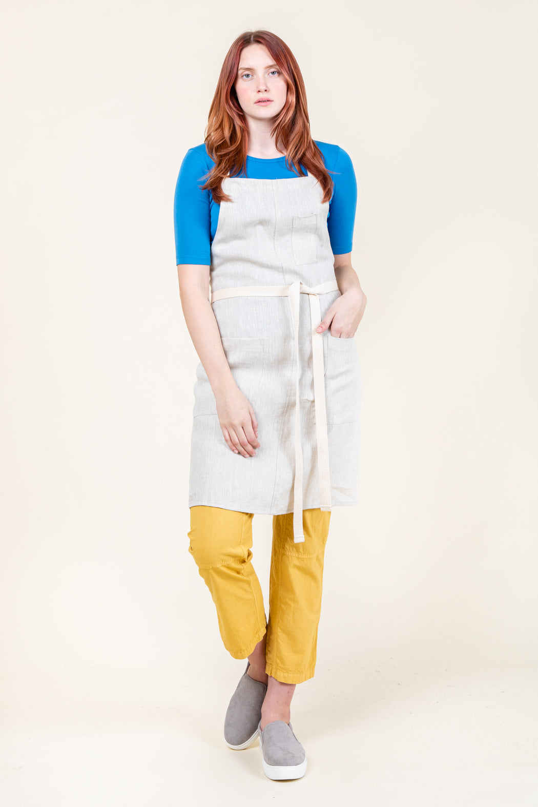 Our multi-use, three pocket apron was initially created as a commission for the staff of West Seattle's Tomo restaurant . Whereas the original version was dyed a deep indigo this iteration is left in its natural color. Made of a heavy weight linen this functional smock is as at home in the kitchen, behind the bar the garden or the studio. We invite you to leave it in its natural state or dye it to your specifications.