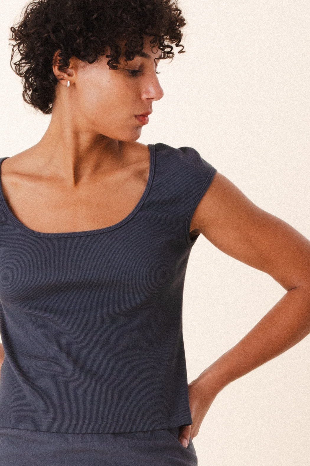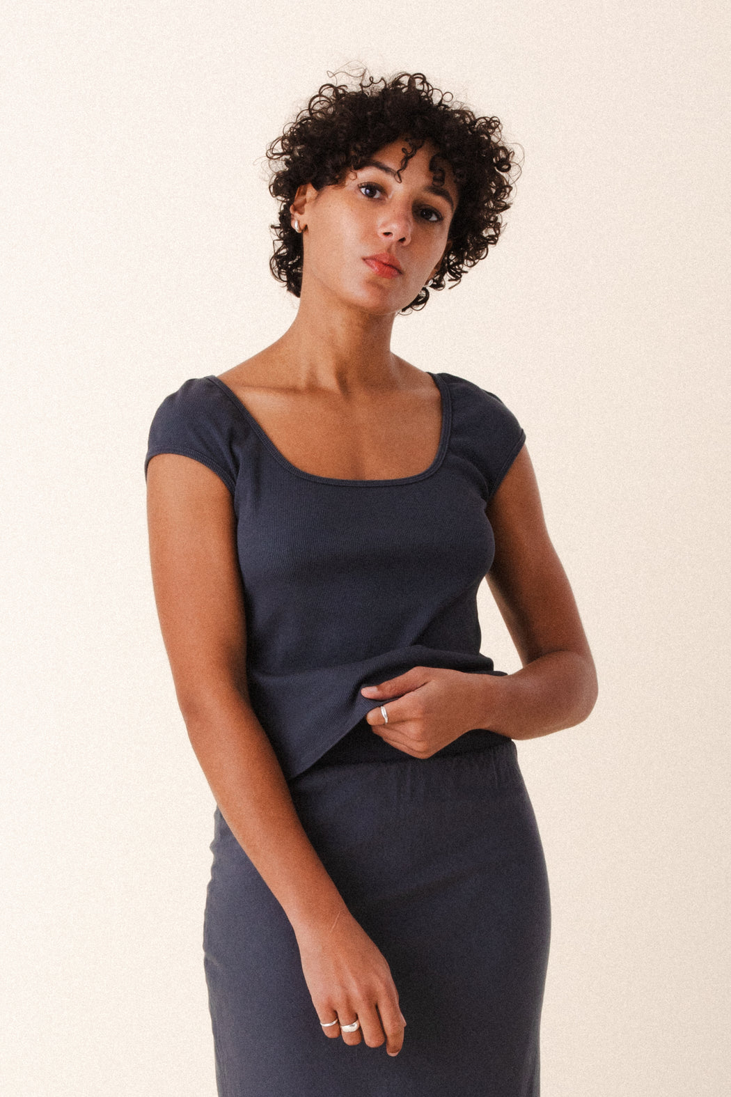 Our signature thick organic cotton rib textile has been used to create a body-sculpting, deep-scoop neck with cap sleeves. This hyper-feminine silhouette flatters diverse body types and can be worn casually or to dress-up your summer look. Whether worn as an under-layer or a summer top, you will find yourself reaching for this perfect basic again and again.