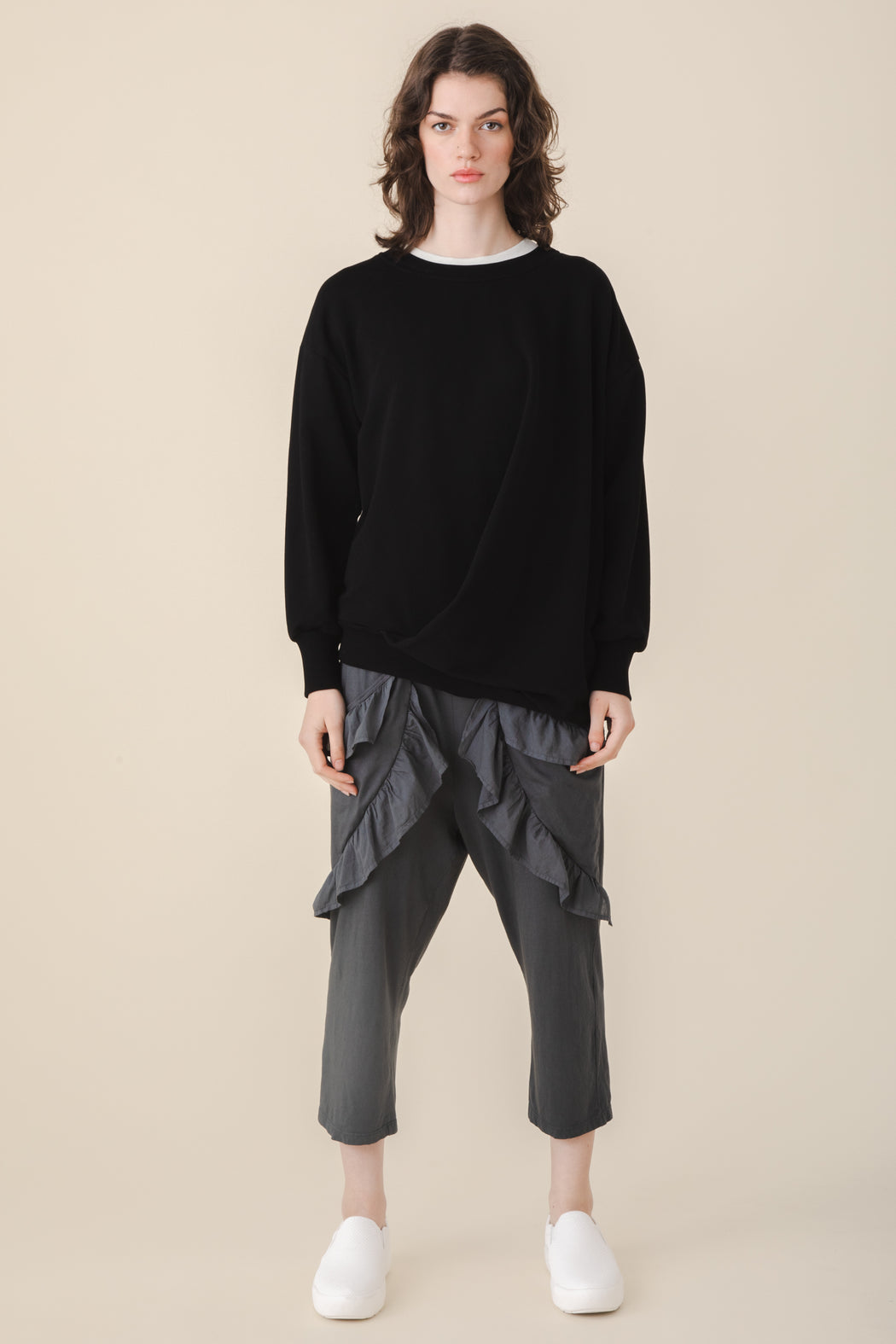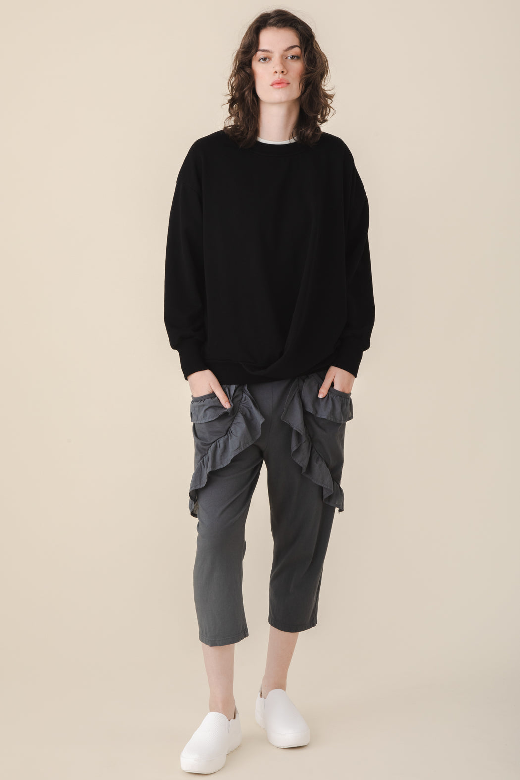 As basic crewneck sweatshirts have become ubiquitous, our drawers are stuffed with them. This is a time for sweatshirts that bend our sense of time and expand the boundaries to become something different. Our crewneck fulfills all the obligations of the genre while providing something more. You will keep this one on a hanger in your closet and pair it with unexpected combinations, over a sundress on cool summer evenings or with wool pants in the Fall.