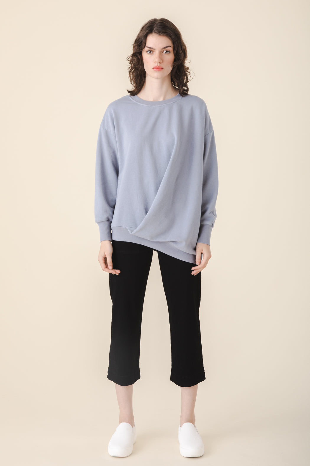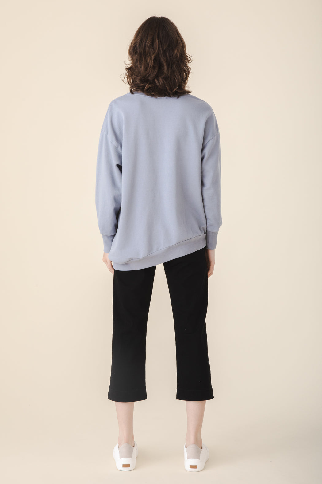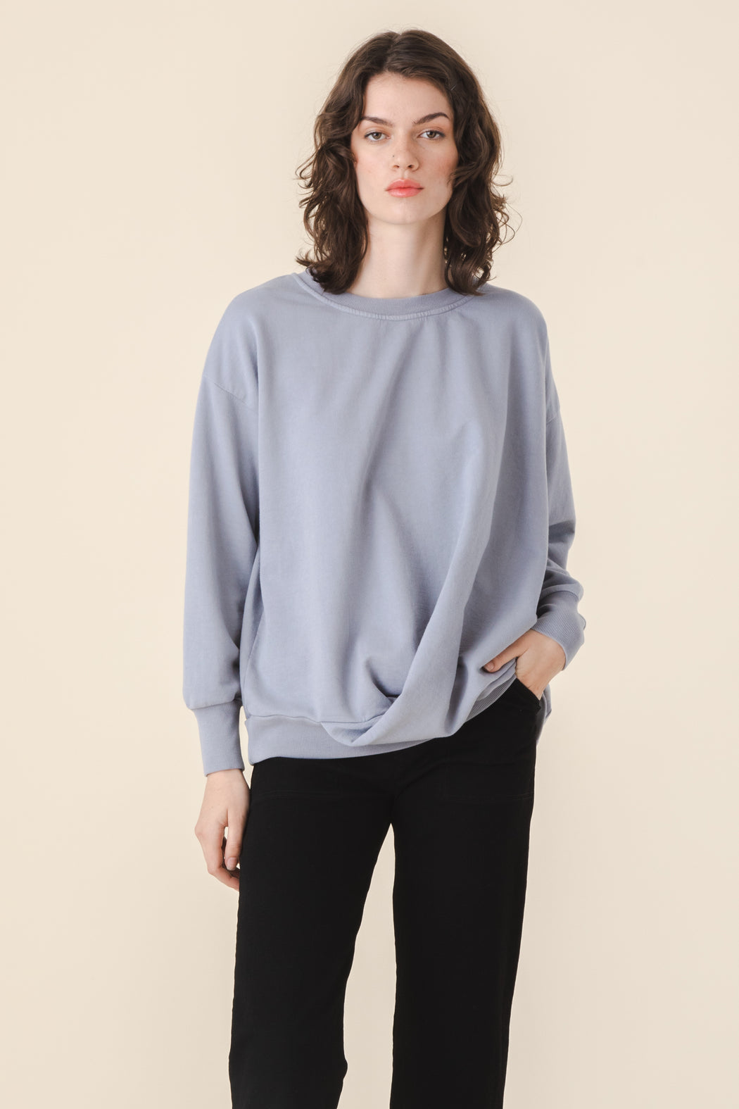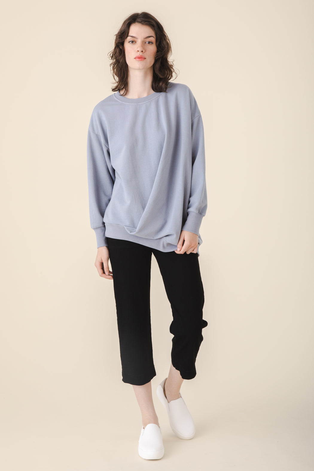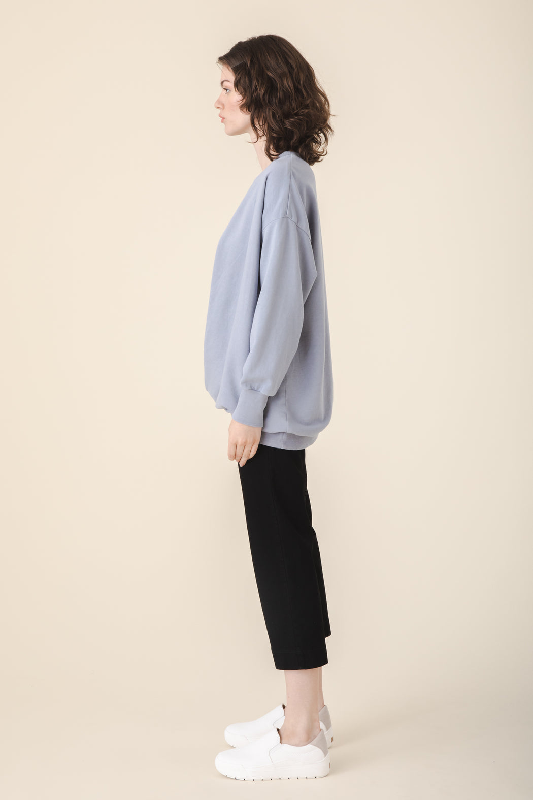 As basic crewneck sweatshirts have become ubiquitous, our drawers are stuffed with them. This is a time for sweatshirts that bend our sense of time and expand the boundaries to become something different. Our crewneck fulfills all the obligations of the genre while providing something more. You will keep this one on a hanger in your closet and pair it with unexpected combinations, over a sundress on cool summer evenings or with wool pants in the Fall.