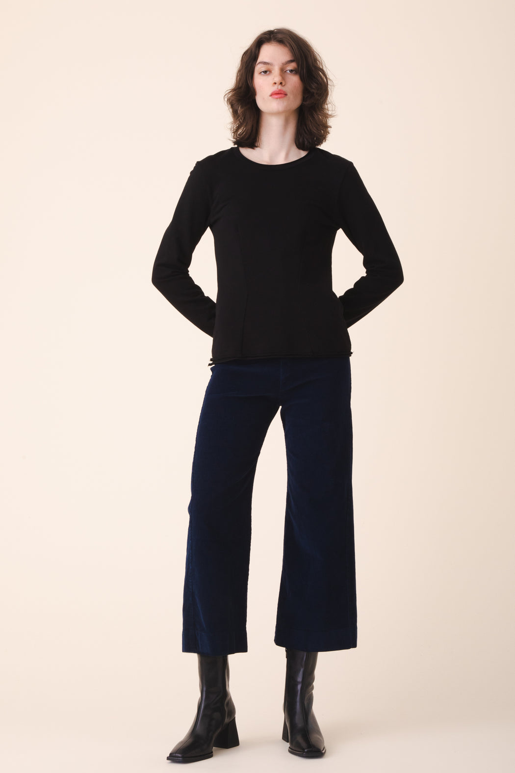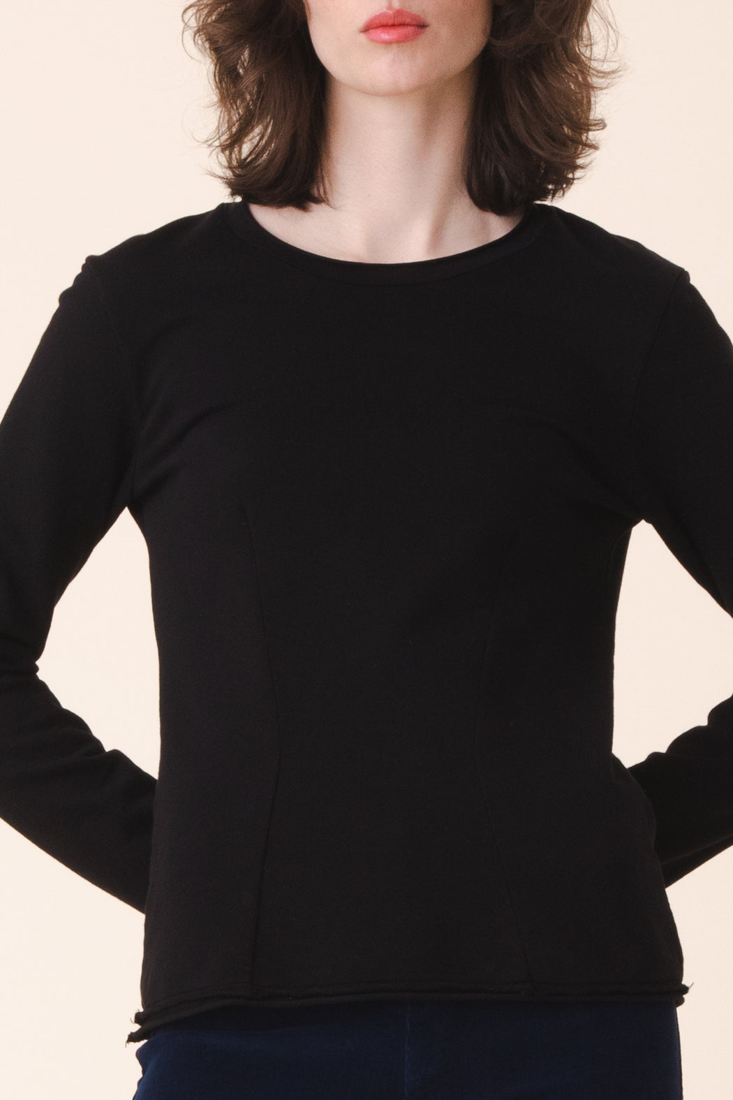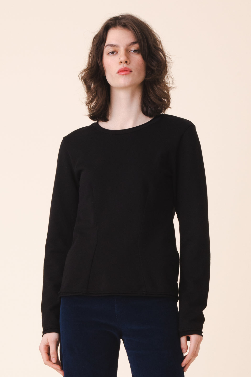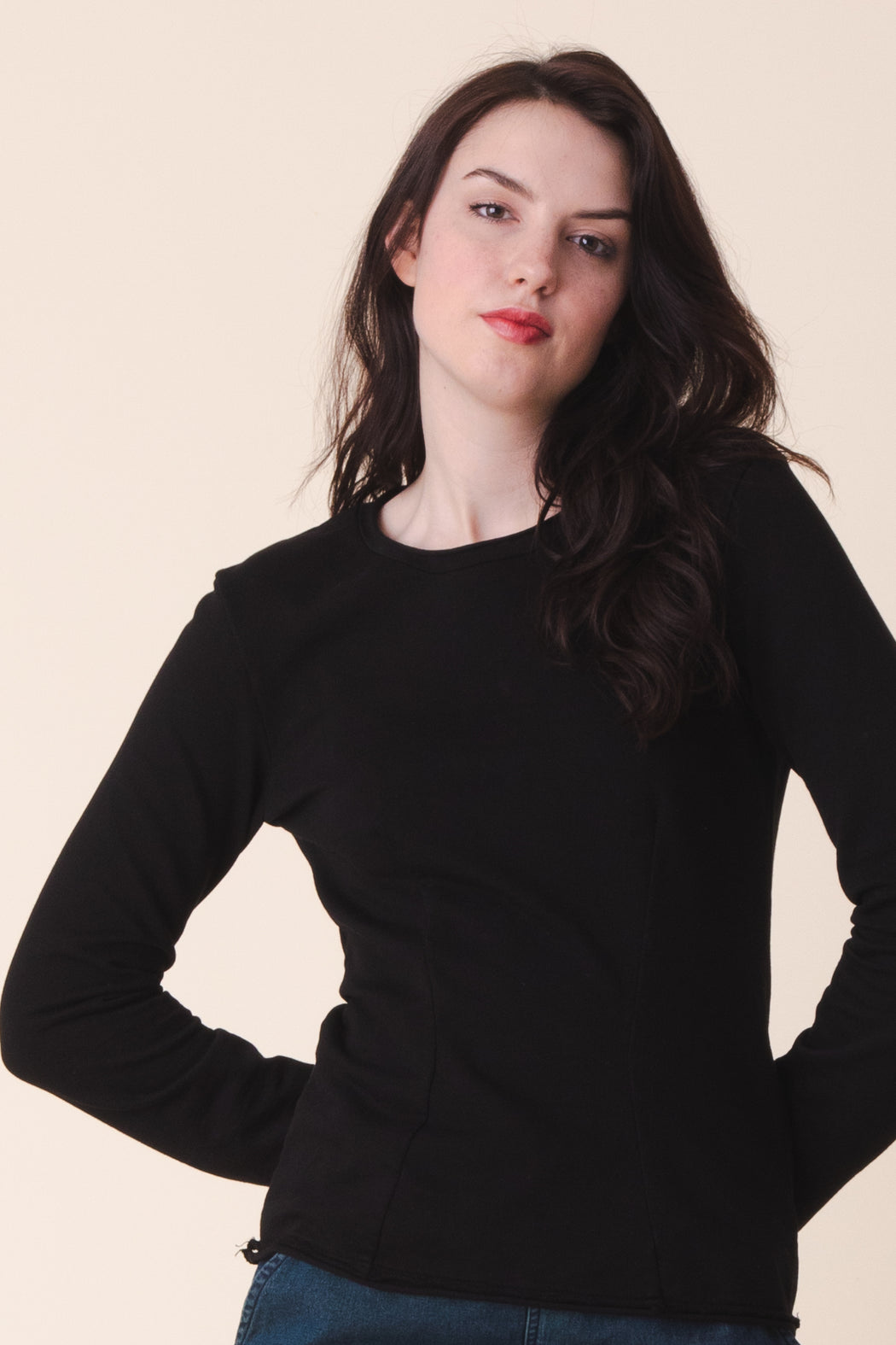 The most archly feminine t-shirt is now a sweatshirt with full darting that accentuates your figure. A new take on our deconstructed neck finishes with subtle dressmaker references. Enduring raw hems maintain the featherweight ease and minimalist rigor of this premium french terry underlayer.