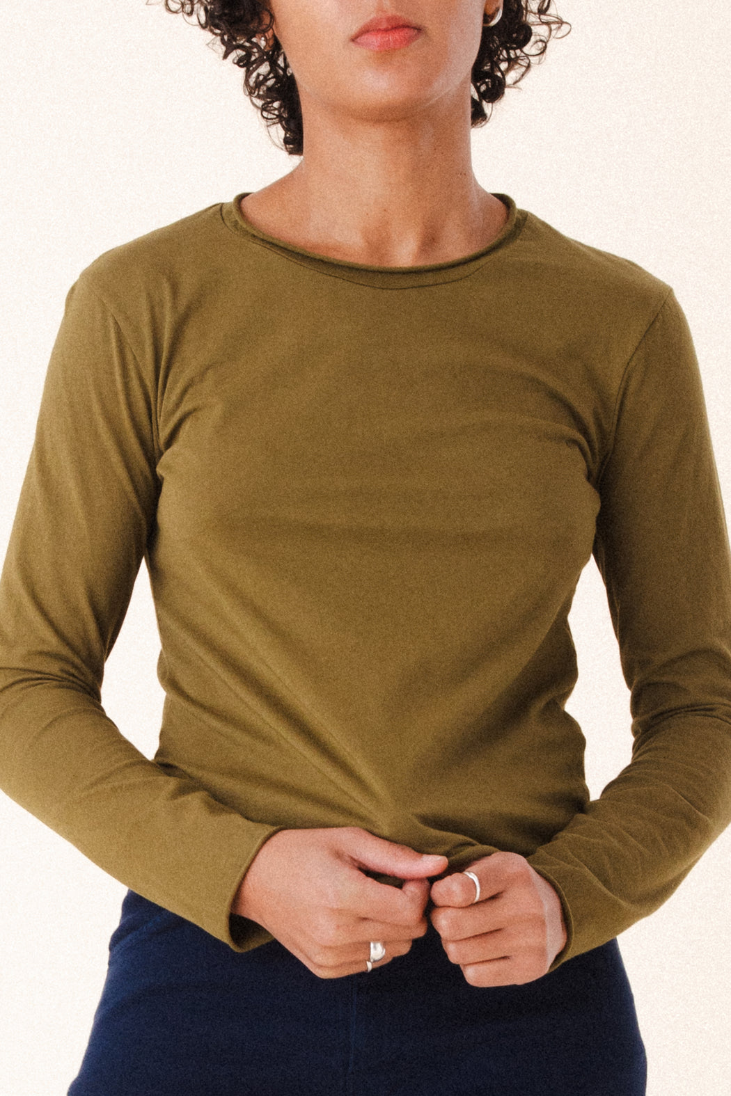 Our soft rolled jersey technique finishes the neck, sleeve, and hemline of this ultrasoft fitted T-shirt. A new take on our deconstructed classics lends a perfectly undone effect. Enduring raw hems maintain the featherweight ease and minimalist rigor of this premium basic tee.