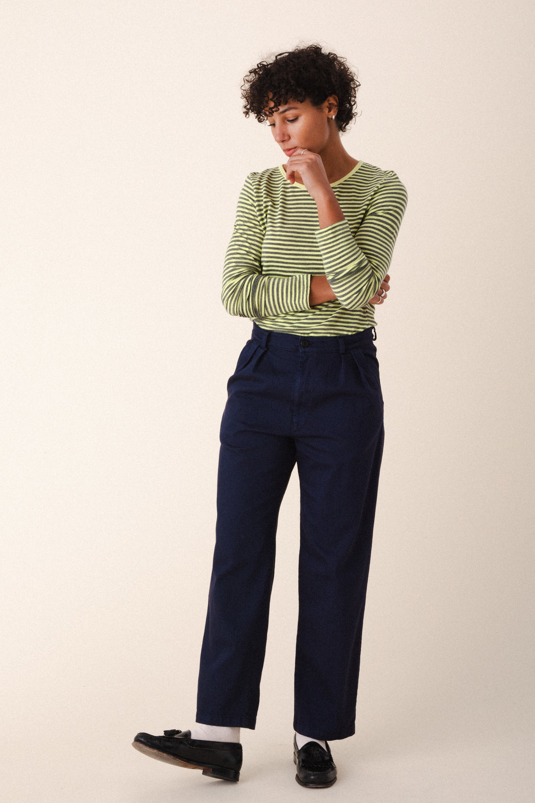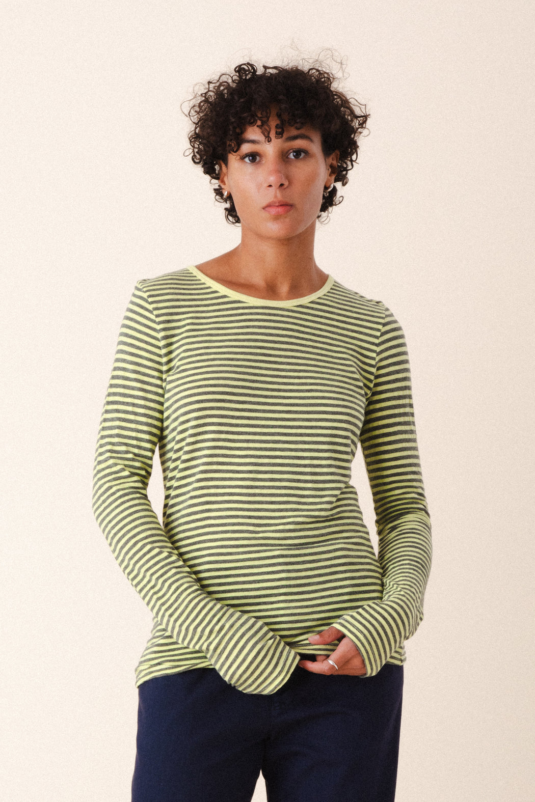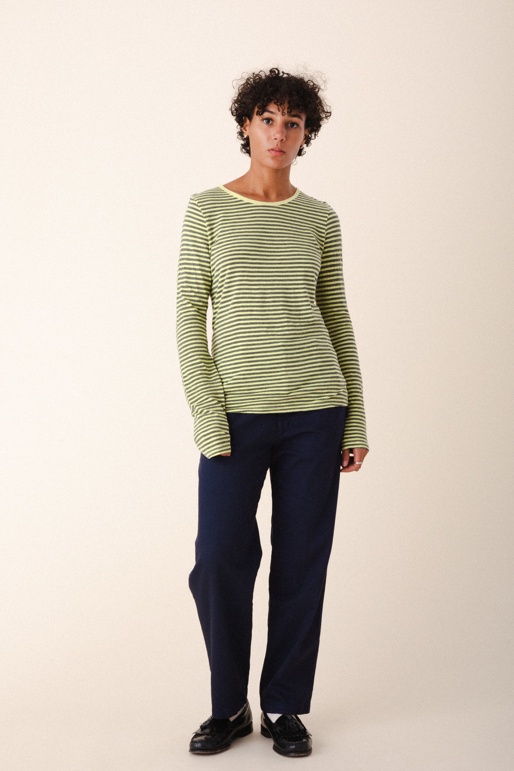 Something so simple that has terrific impact, a striped basic, will elevate any ensemble to evoke a tone of intellectual freedom and independence. Offered here in neutral and bright tones to play with the riotous colors of the season, it may also be worn in the most traditional manner with understated chinos.