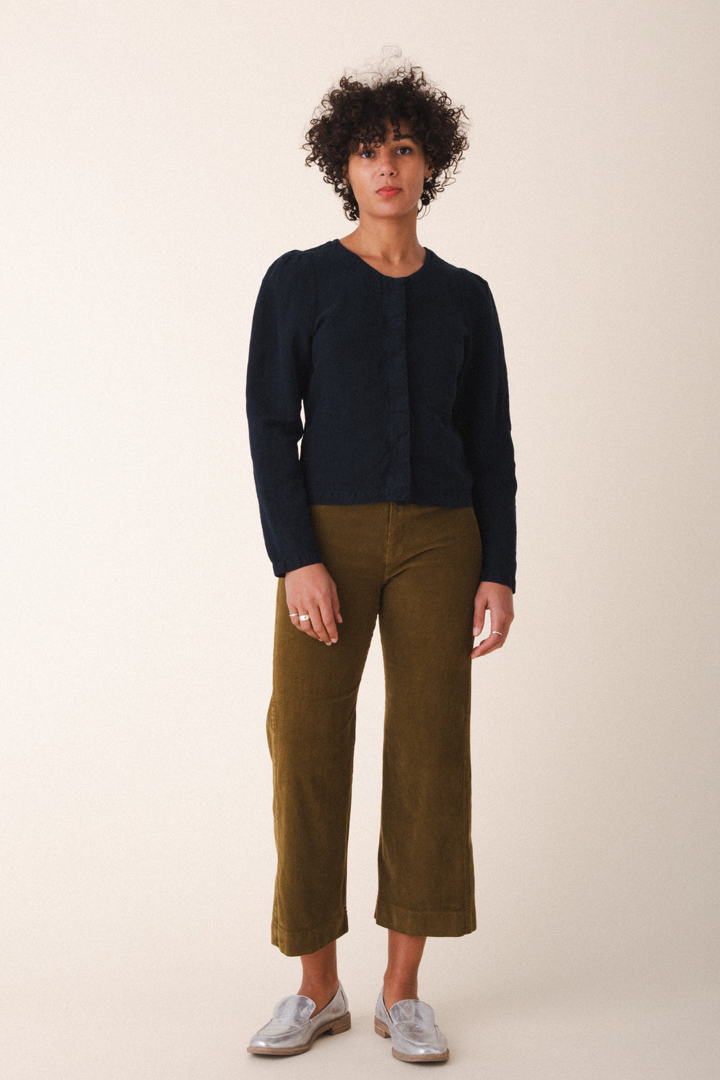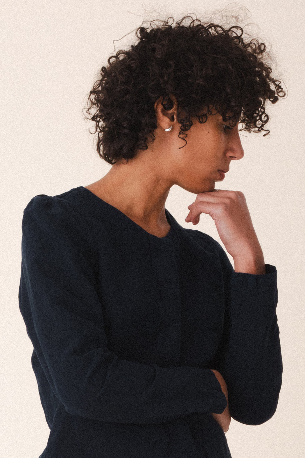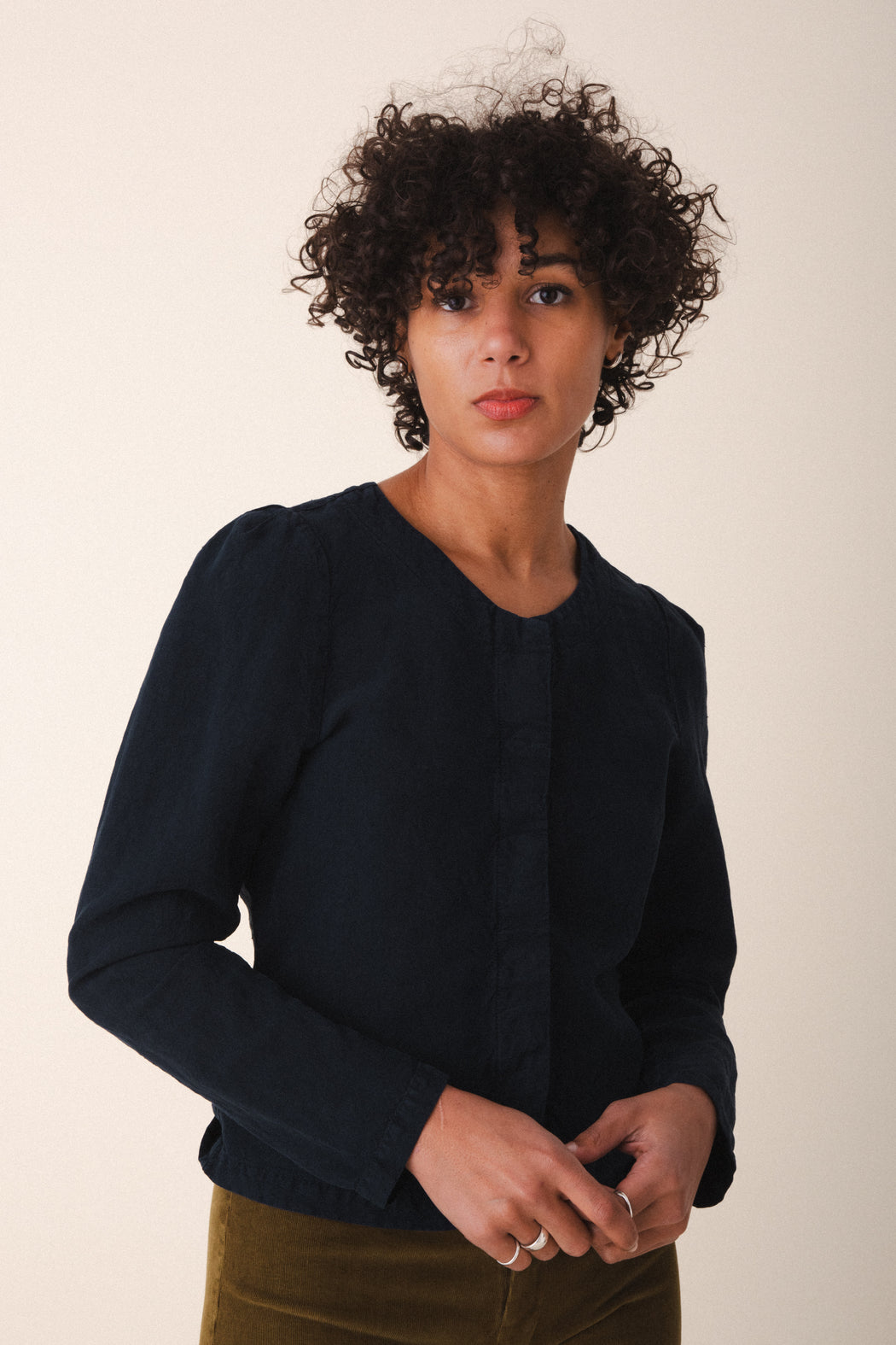 A return to historic designs of early American dress is not always traditional. The observation of a particular form can foster new directions. A tailored blouse with a covered button placket, high neckline, and a slightly puffed shoulder has always been part of our progressive vision. Constructed in an elegant hemp and silk blend for formal and informal occasions.
