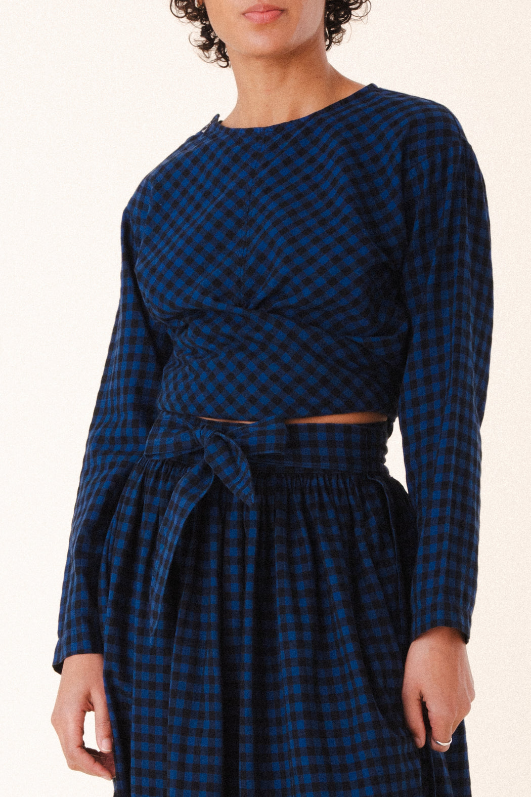 A 50s-inspired flannel wrap blouse with a modern feeling. Whether worn with full skirts or a twill jogger the look is effortless, impactful, and warm. An easy pullover blouse that instantly sharpens any ensemble with the powerful graphic impact of our deadstock flannels.
