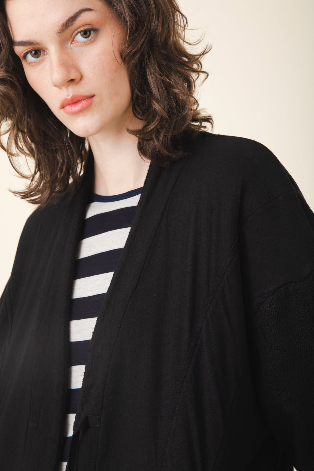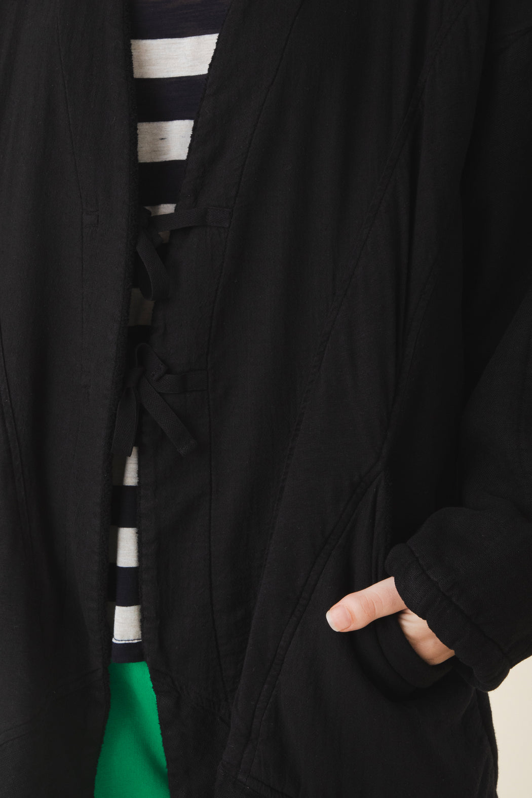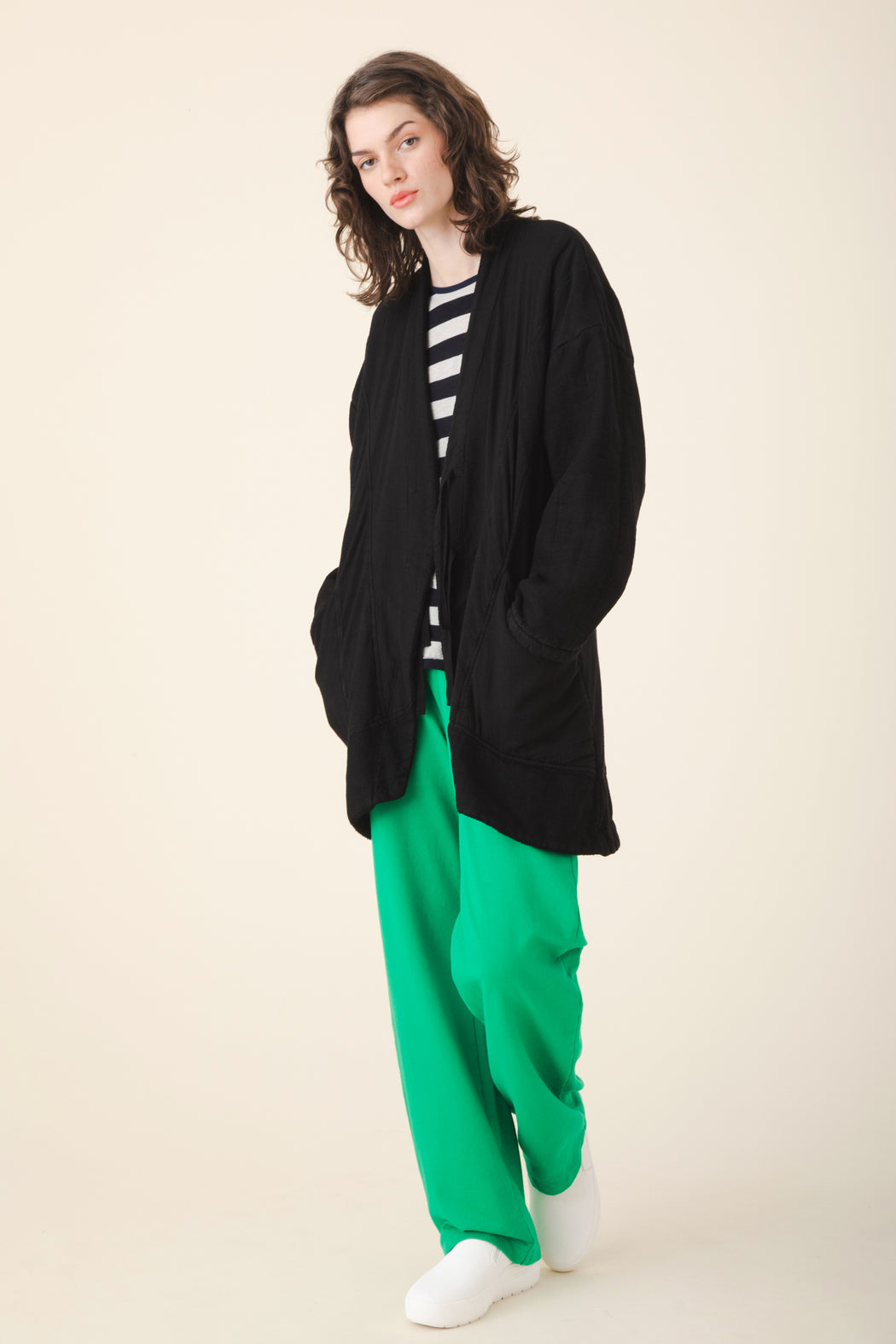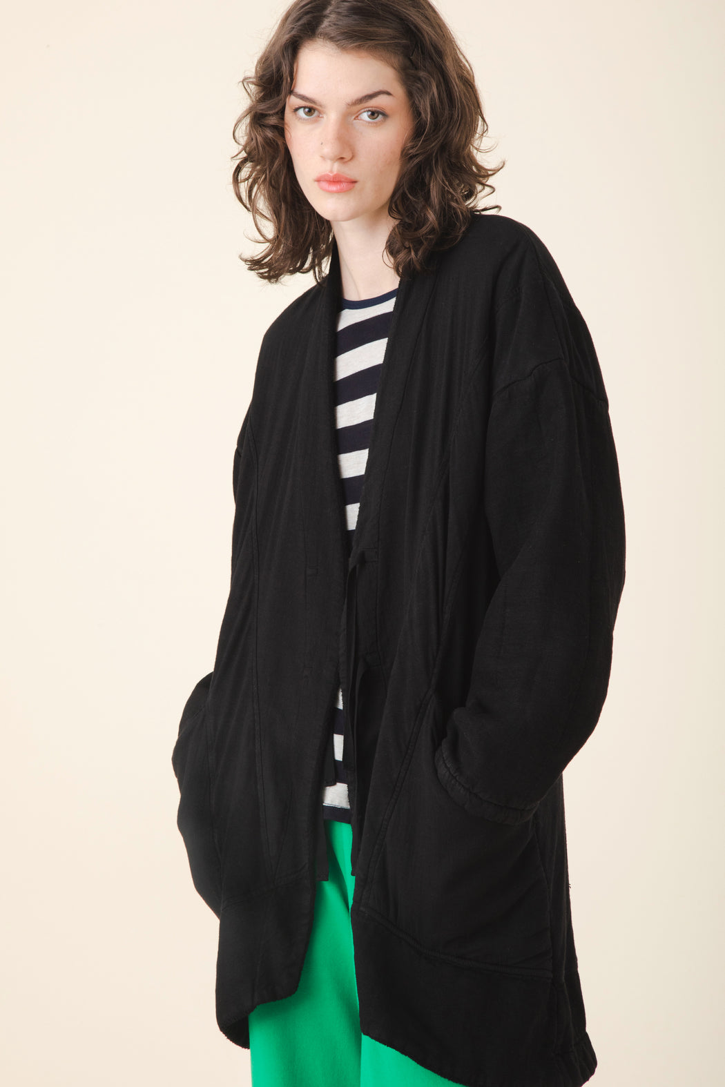 Sometimes a sketch left on the drawing board becomes a point of interest for new techniques. With our recent foray into patchwork, textiles from previous collections have been drawn to create a collage of stripes and quilting, undergirded by a lush organic shearling lining, to create a great soft coat with a warm complexity. This a piece for those who love handwork, quilting, and texture.