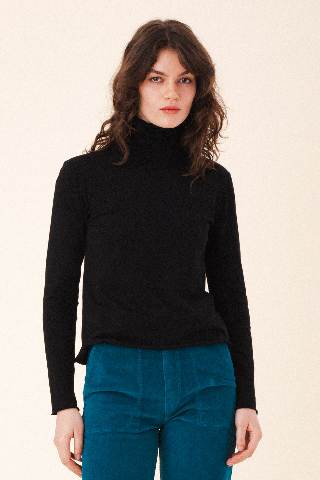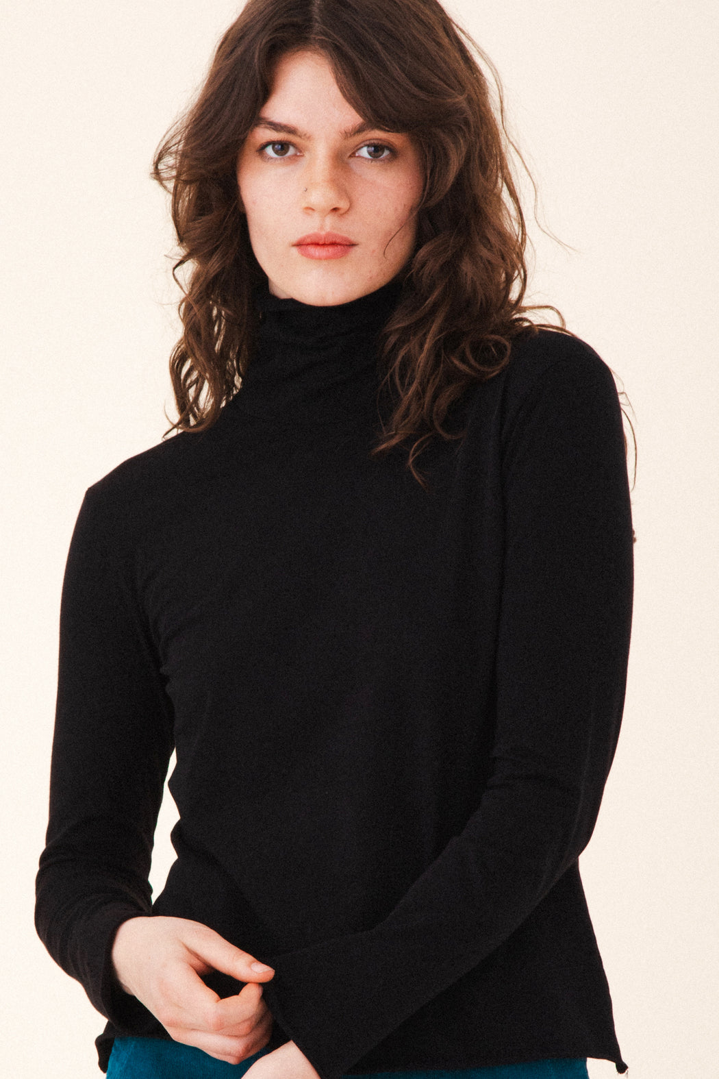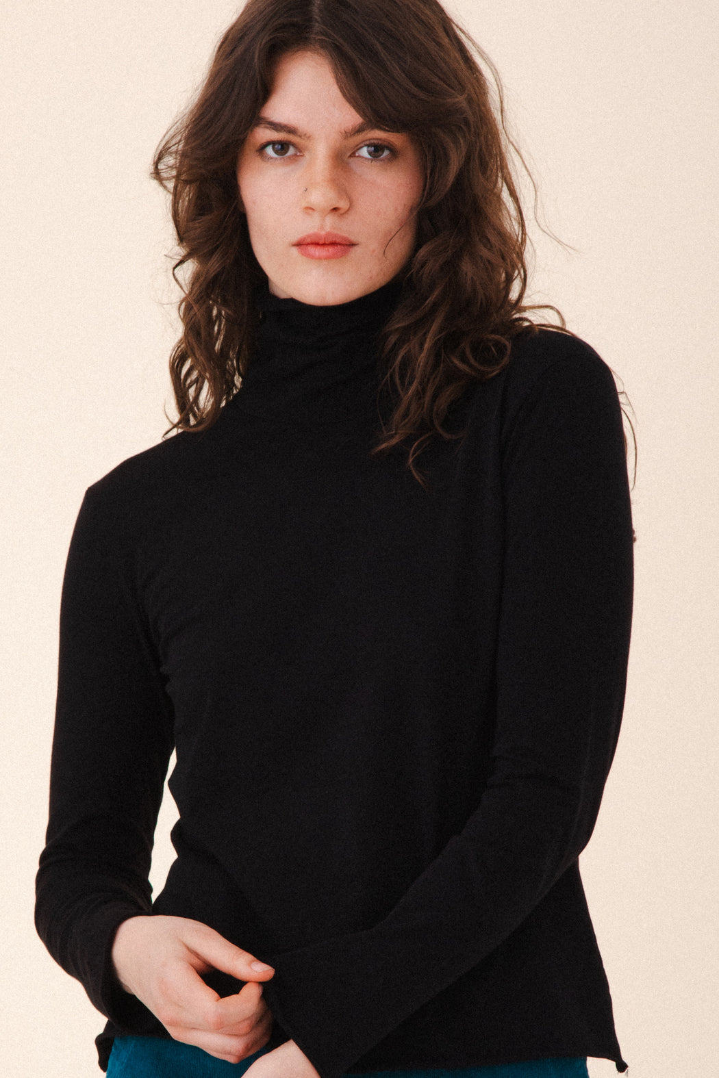Effortlessly elegant, the Barre T-Neck is a sleek essential with a soft, slouchy neckline and delicate rolled hem details. Crafted from our softest organic cotton jersey, it offers a smooth, streamlined fit that layers beautifully or stands strong on its own. Designed for versatility and inspired by winter’s quiet calm, the turtleneck can be worn scrunched or folded—your mood, your way.