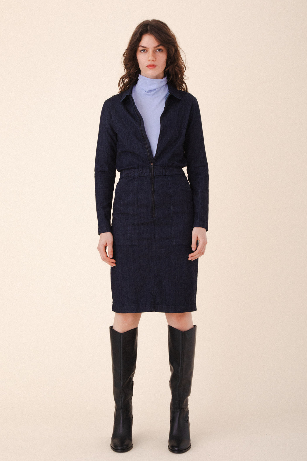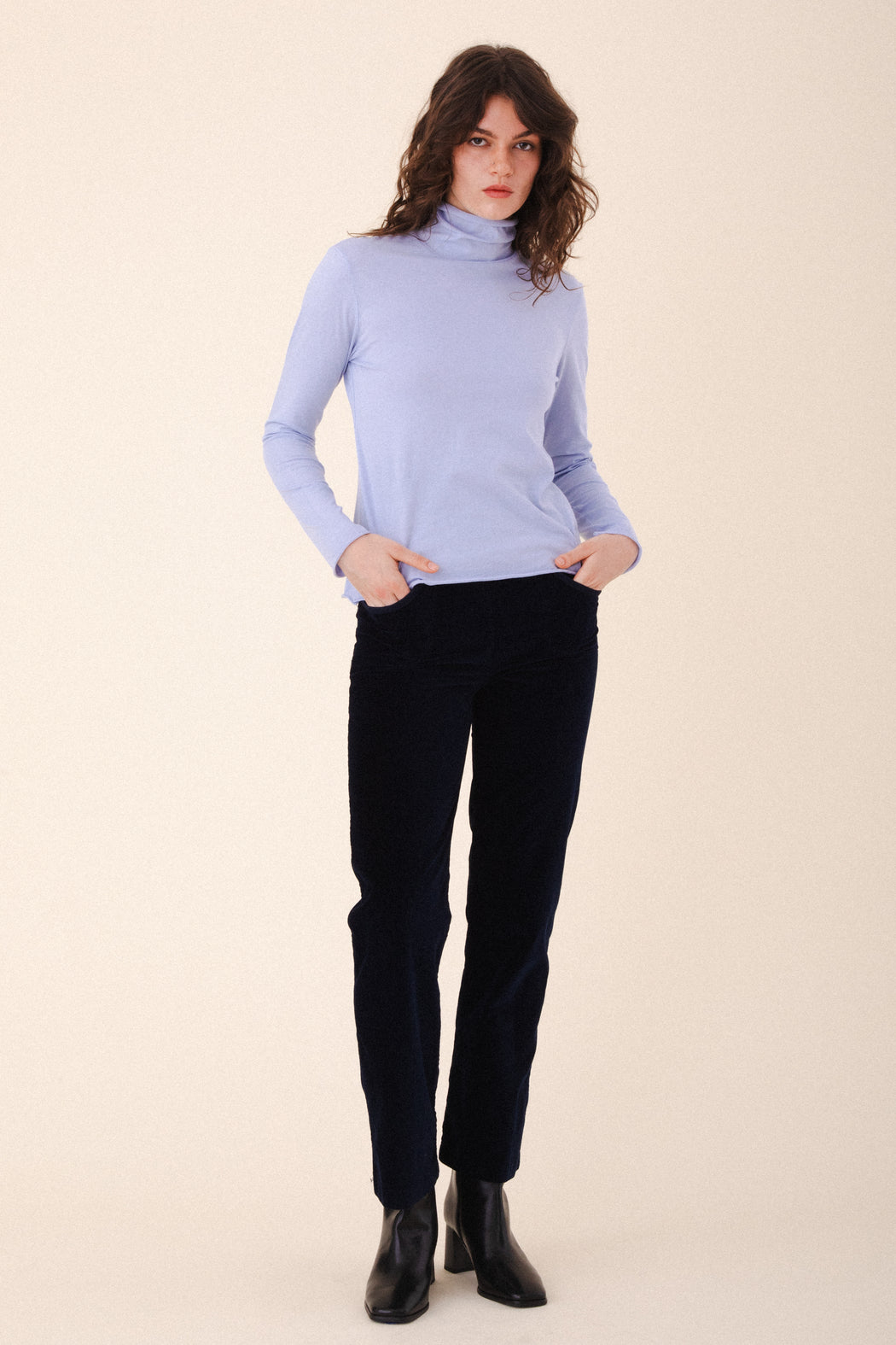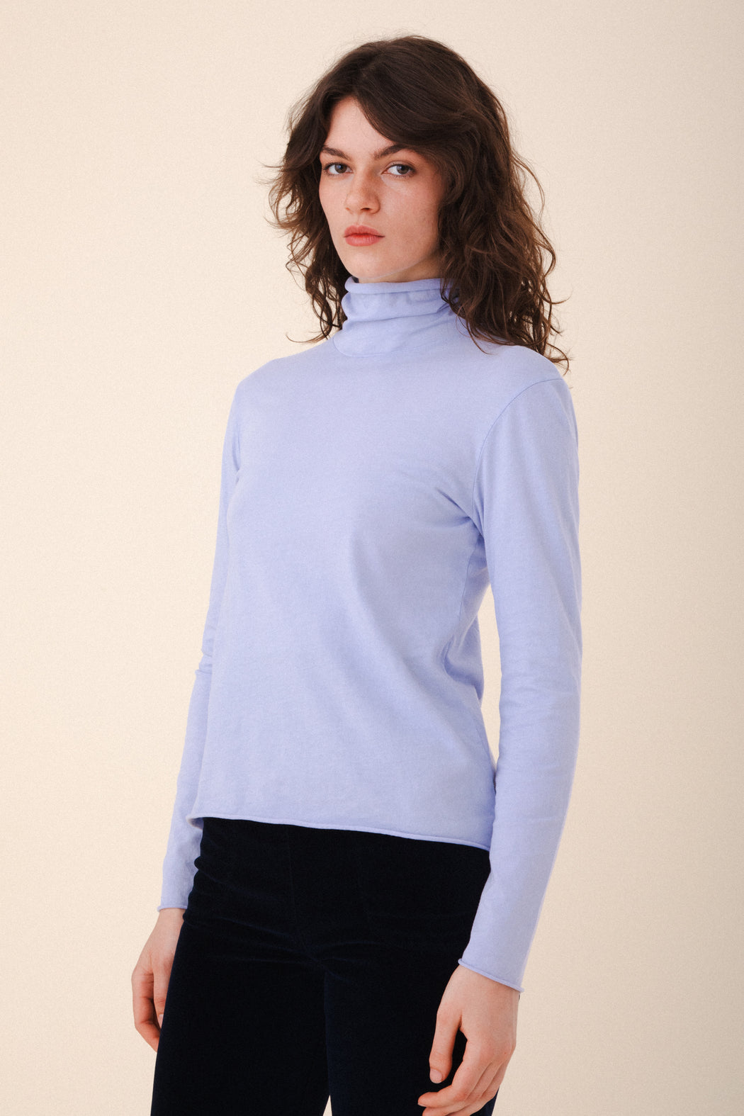 Effortlessly elegant, the Barre T-Neck is a sleek essential with a soft, slouchy neckline and delicate rolled hem details. Crafted from our softest organic cotton jersey, it offers a smooth, streamlined fit that layers beautifully or stands strong on its own. Designed for versatility and inspired by winter’s quiet calm, the turtleneck can be worn scrunched or folded—your mood, your way.