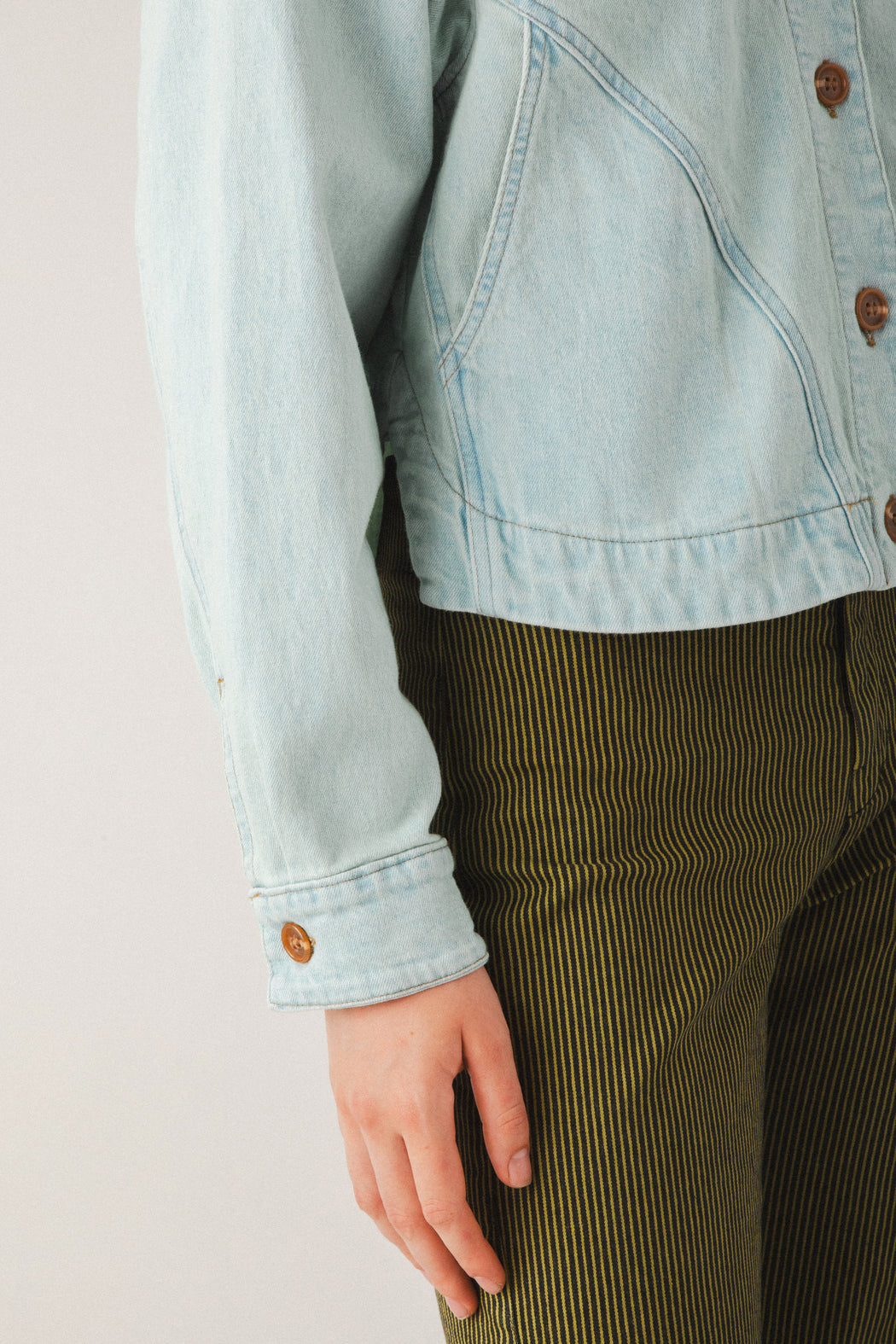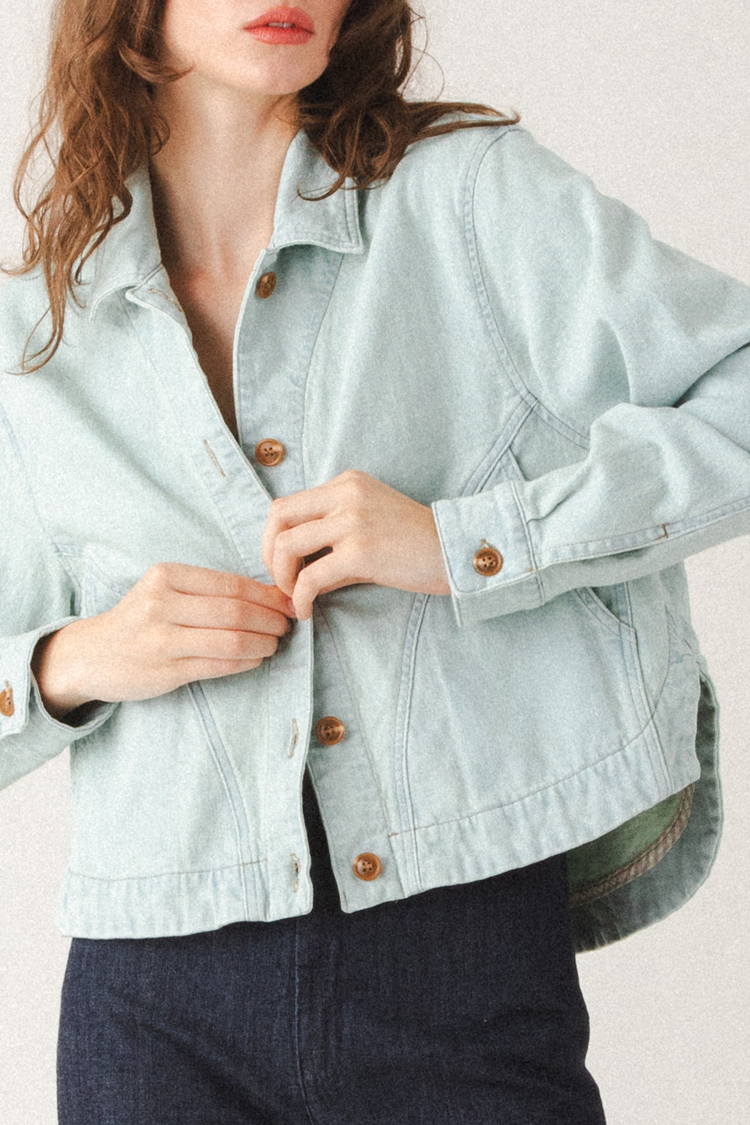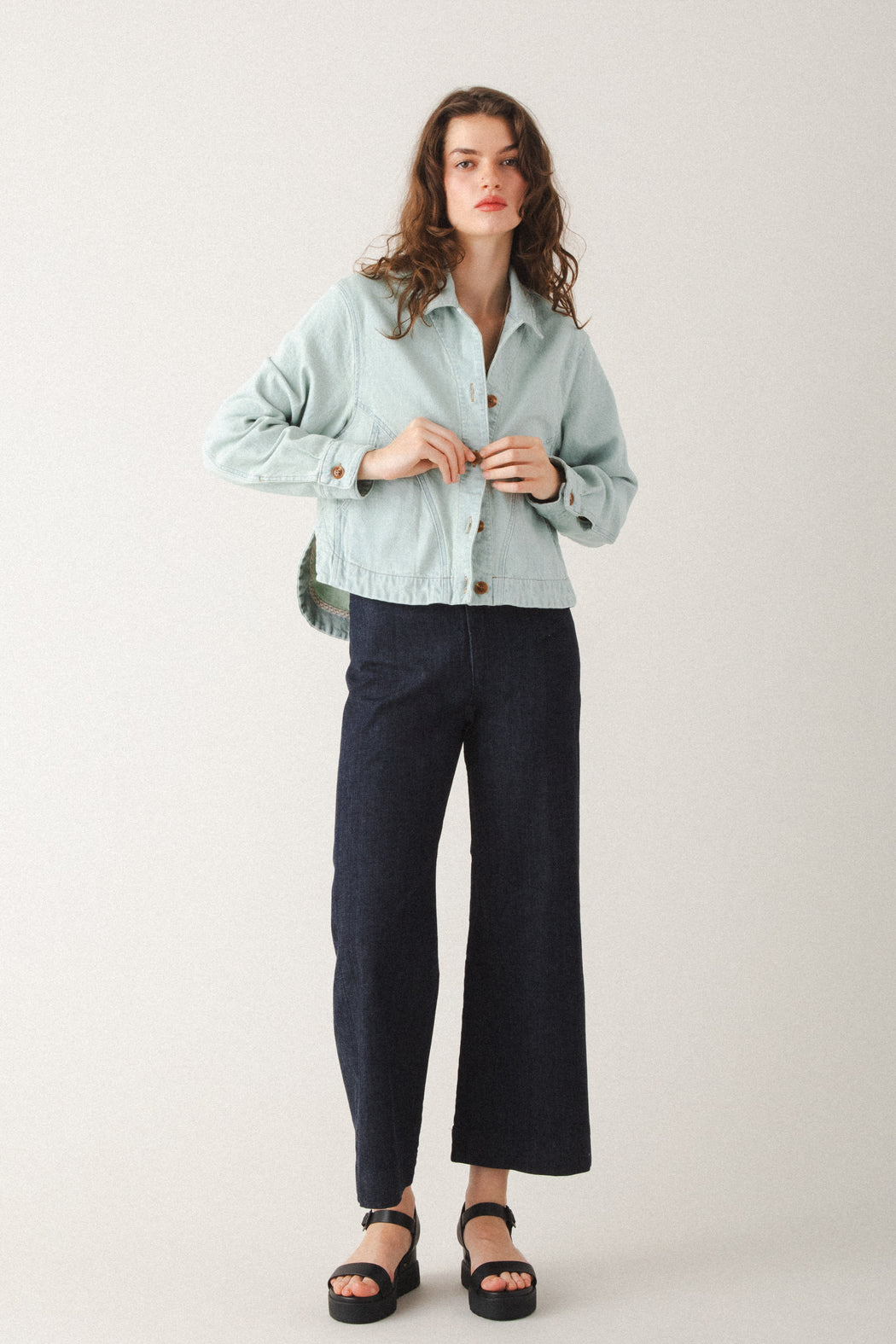 By juxtaposing curved and square shapes, the Juxtapose Jacket reimagines the classic jean jacket with a fresh, artful silhouette. Curved inset pockets and a rounded shirttail back hem are balanced by a square-cut front and classic shirt collar. The result is a bold yet versatile piece that blends utility, comfort, and thoughtful design. A true standout that styles effortlessly with dresses, denim, or tailored separates. Pair it with the Modette Jeans for a modern, head-turning suiting look.