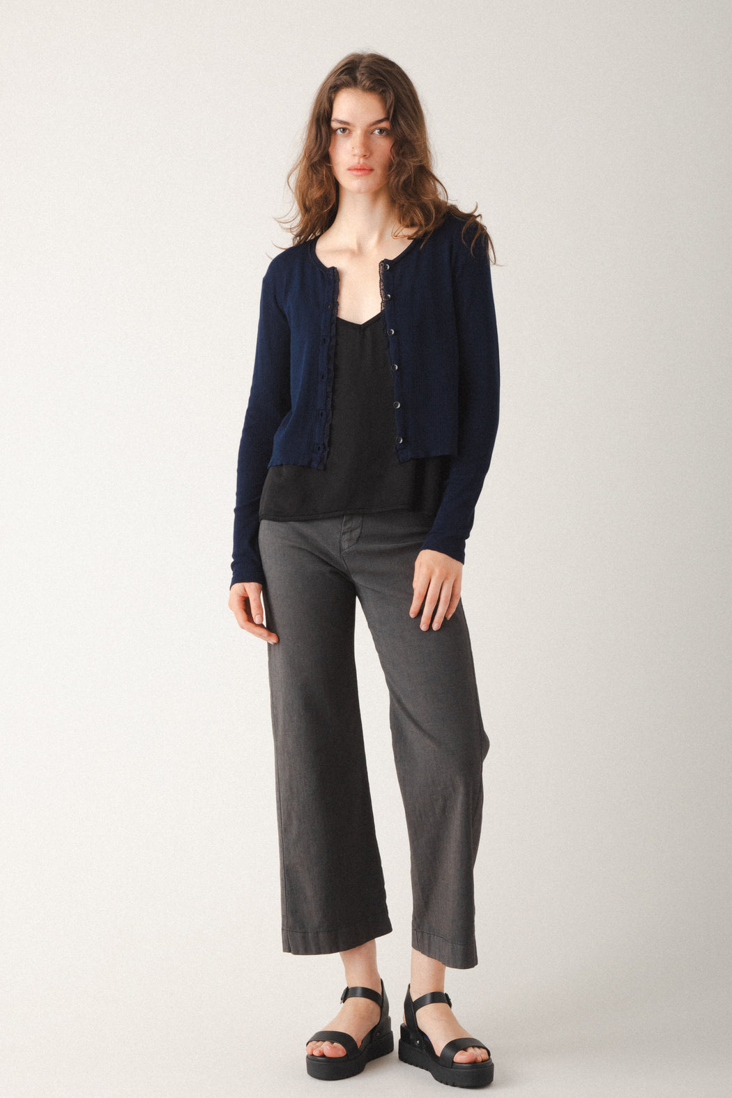 – Wide leg, cropped silhouette with structured drape