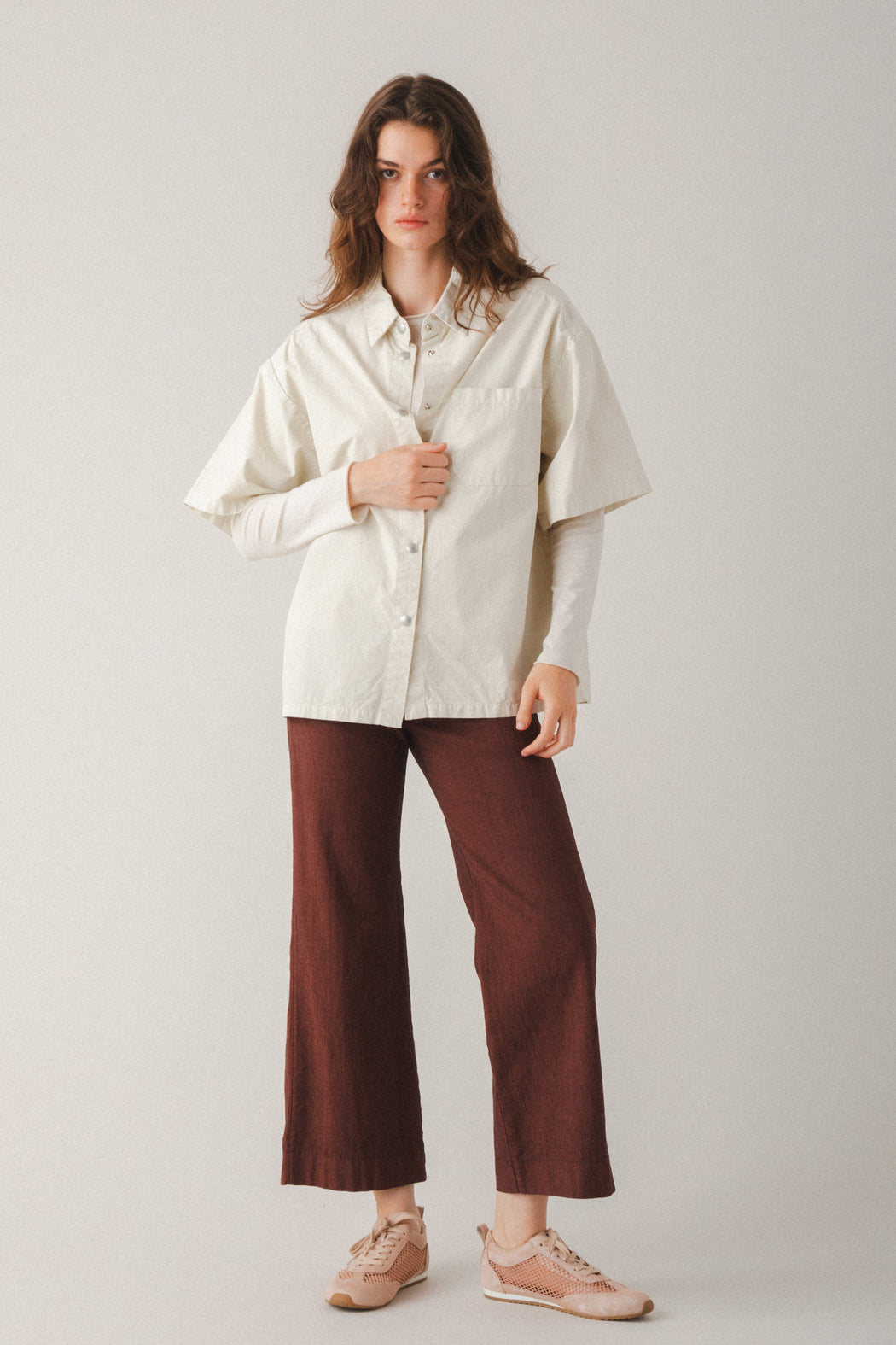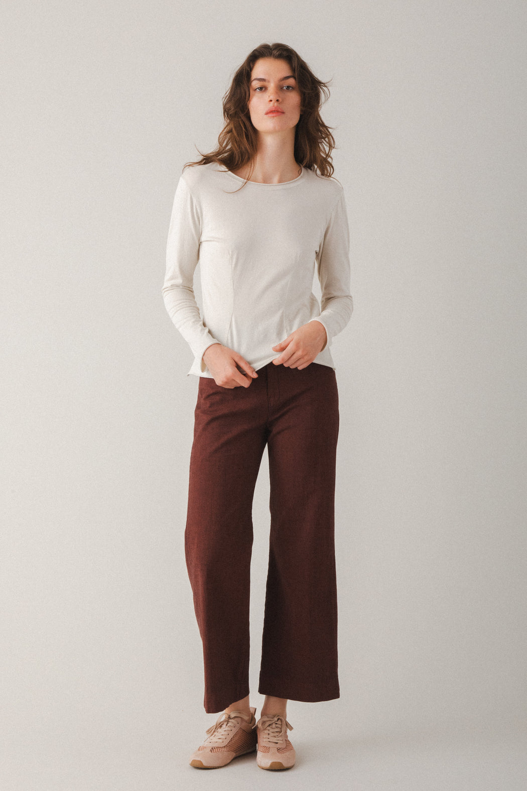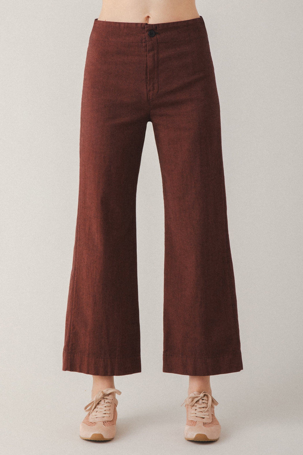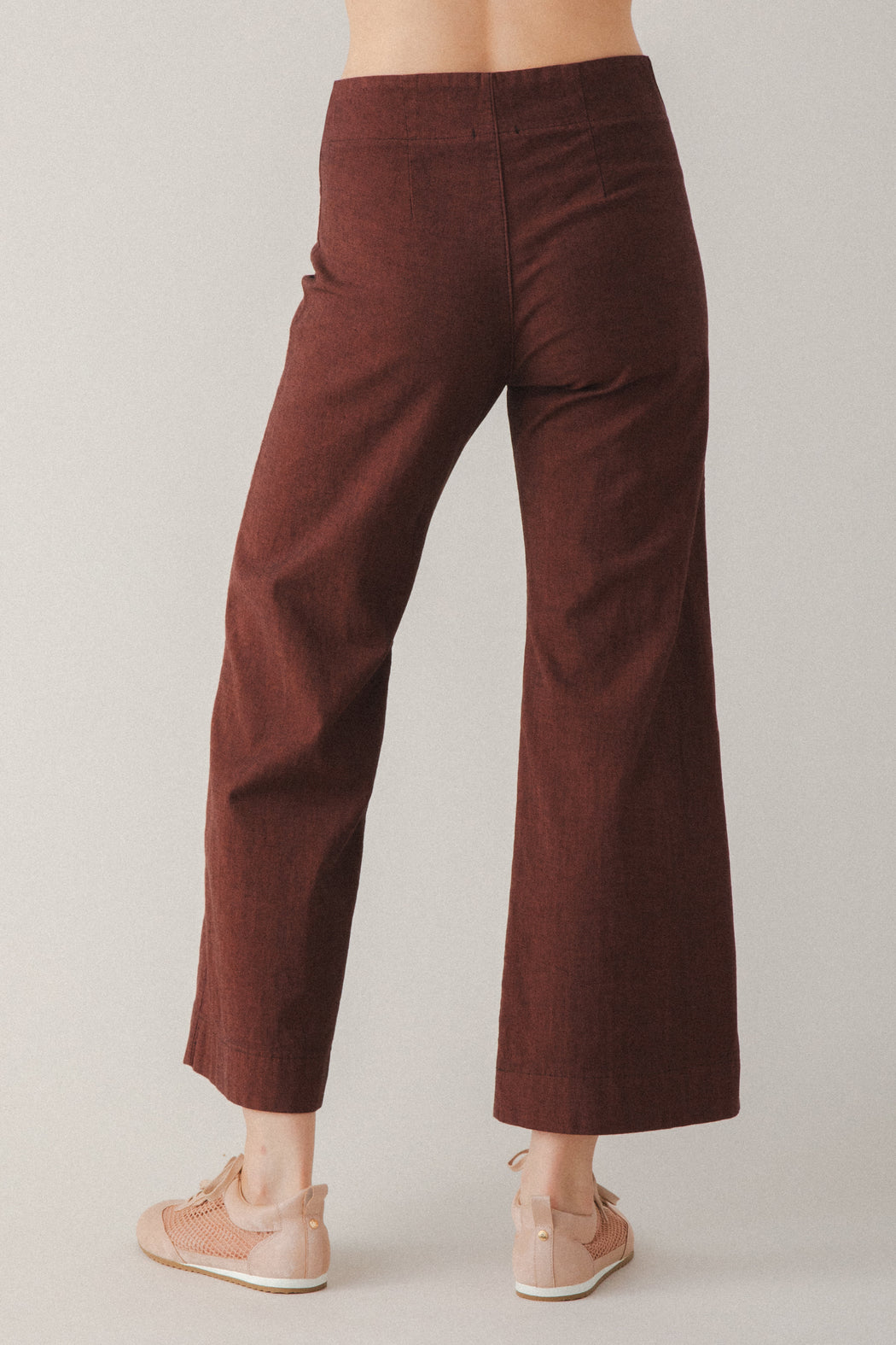 A sleek, mid-rise, wide-leg, cropped pant made with high-stretch denim is casual and classic. Two back darts for shaping and no pockets suggest a minimal look that is also ideal for layering.