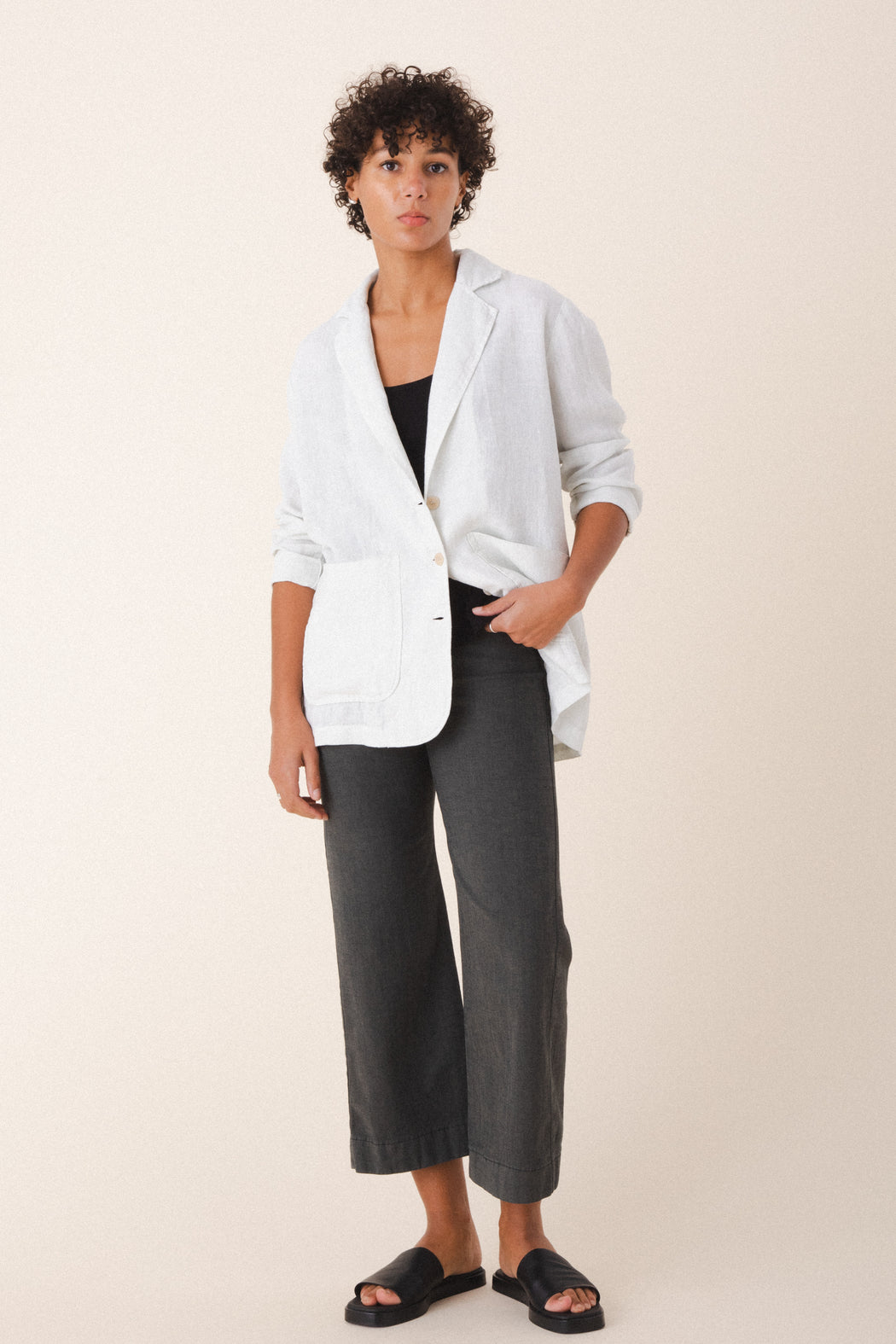 A sleek, mid-rise, wide-leg, cropped pant made with high-stretch denim is casual and classic. Two back darts for shaping and no pockets suggest a minimal look that is also ideal for layering.