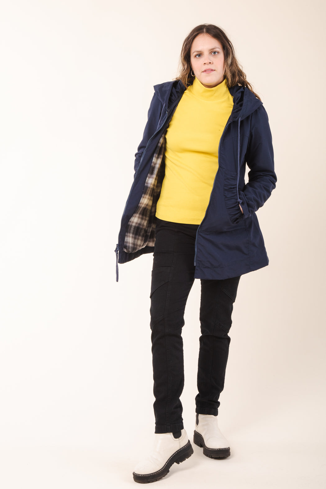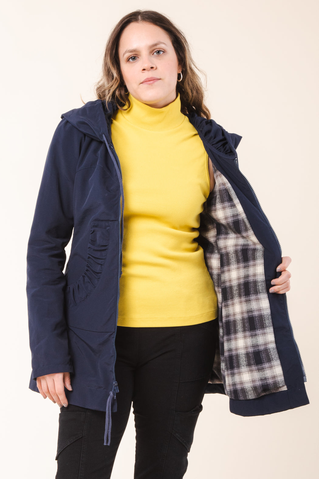 You asked for it and we listened! Our best selling Long Raincloak is now available in a flattering mid-length version. This piece has the same Victorian detailing, exaggerated hood with draw cord, and soft cotton flannel lining but is 6” shorter ending at upper thigh. The shorter silhouette has a less exaggerated flair and feels light and sporty. A water-resistant raincoat perfect for light showers and windy afternoons. We recommend sizing up if you plan to layer. Cut, sewn, and finished where we live in Seattle. Our collection directly supports manufacturing in the United States.