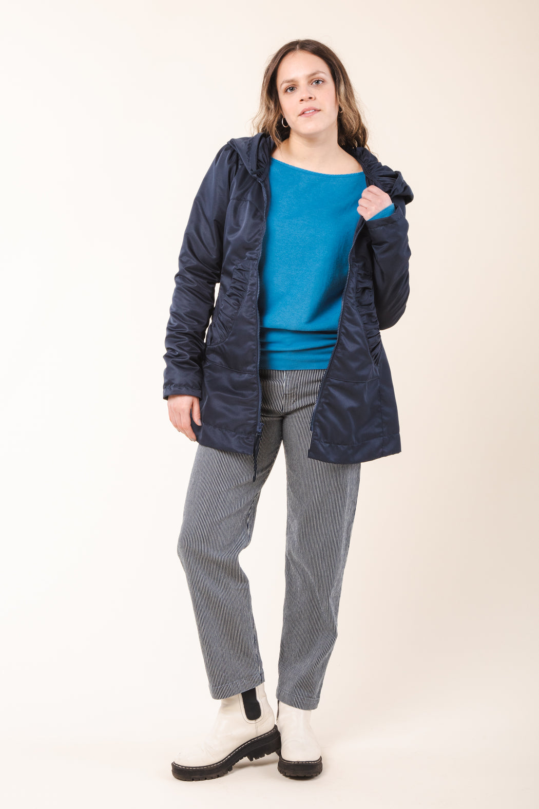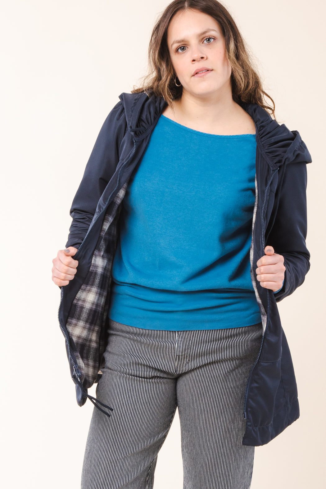 You asked for it and we listened! Our best selling Long Raincloak is now available in a flattering mid-length version. This piece has the same Victorian detailing, exaggerated hood with draw cord, and soft cotton flannel lining but is 6” shorter ending at upper thigh.  The shorter silhouette has a less exaggerated flair and feels light and sporty.  A water-resistant raincoat perfect for light showers and windy afternoons. We recommend sizing up if you plan to layer. Cut, sewn, and finished where we live in Seattle. Our collection directly supports manufacturing in the United States.