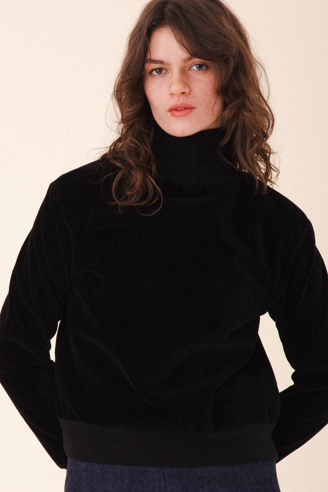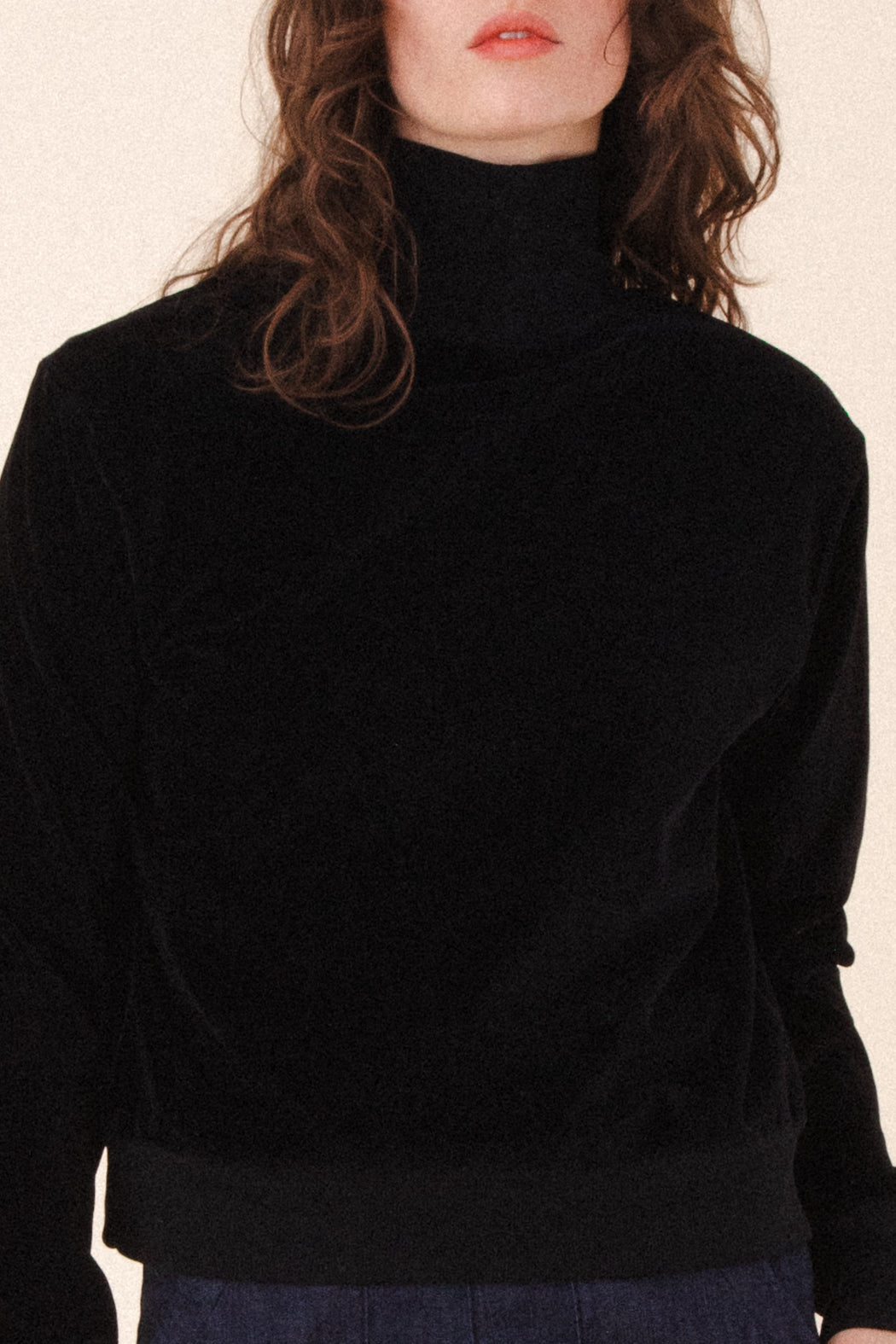 A modern pullover with a relaxed mock neck and roomy sleeves. Designed in a rich cotton/spandex velvet with stretch for movement. For the rebels who seek quiet luxury. Can be worn as a matching set with the Easy Street bottoms.