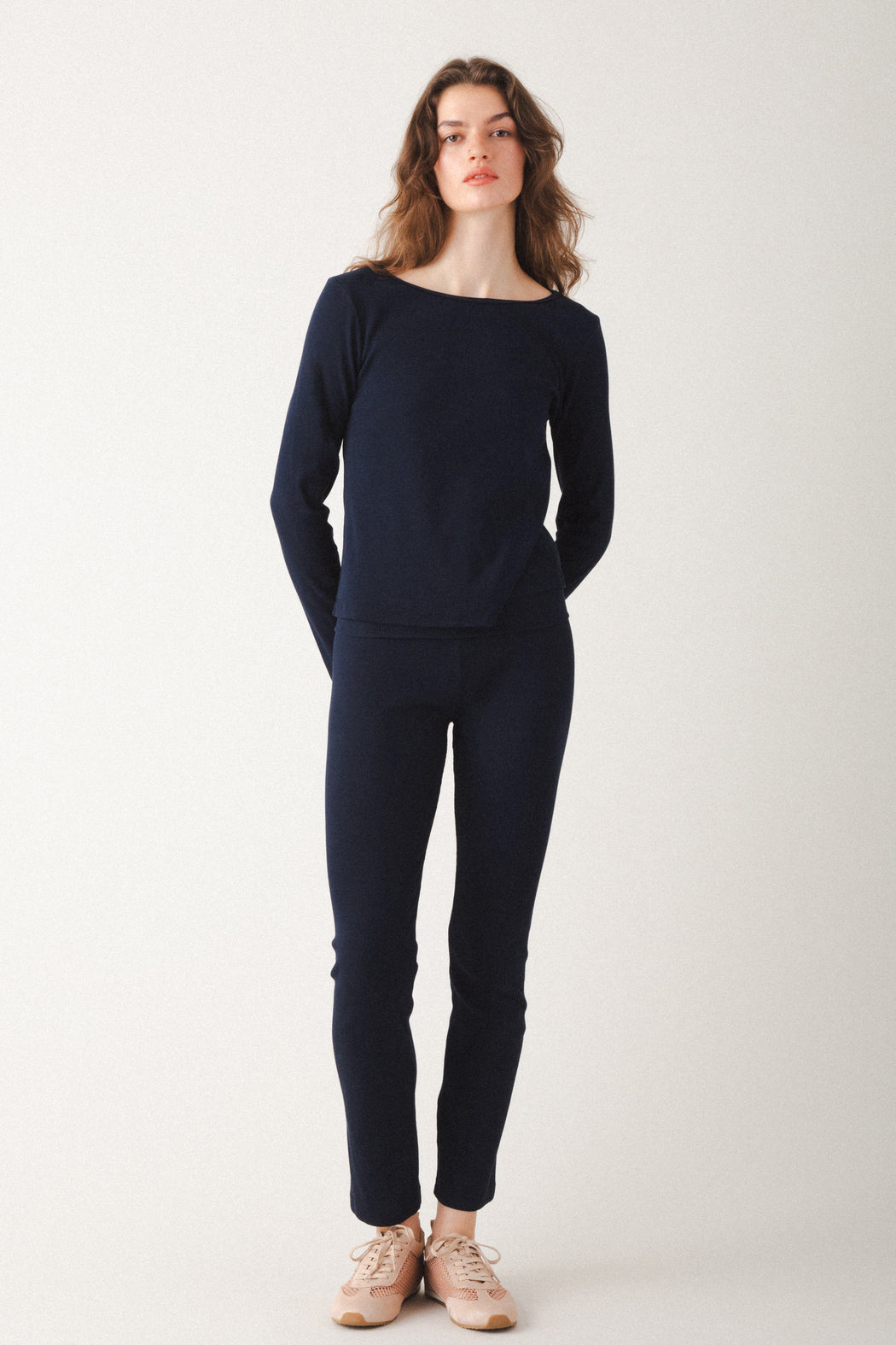 An everyday essential with an understated elegance, the Sandolo Top is crafted from an organic cotton/spandex blend that feels soft against the skin while offering just the right amount of structure. Its timeless long-sleeve silhouette makes it the ultimate layering piece — wear it under jackets, tucked into the Long Carpenter Pant, or relaxed over denim. A sustainable staple you’ll reach for year-round.
