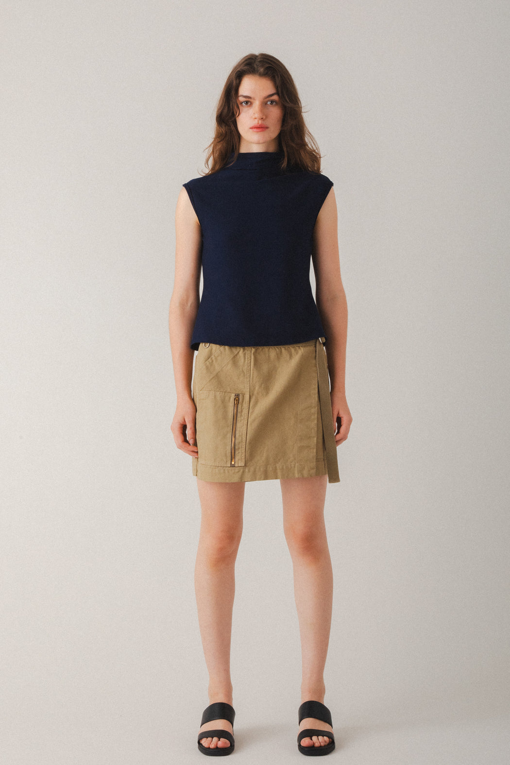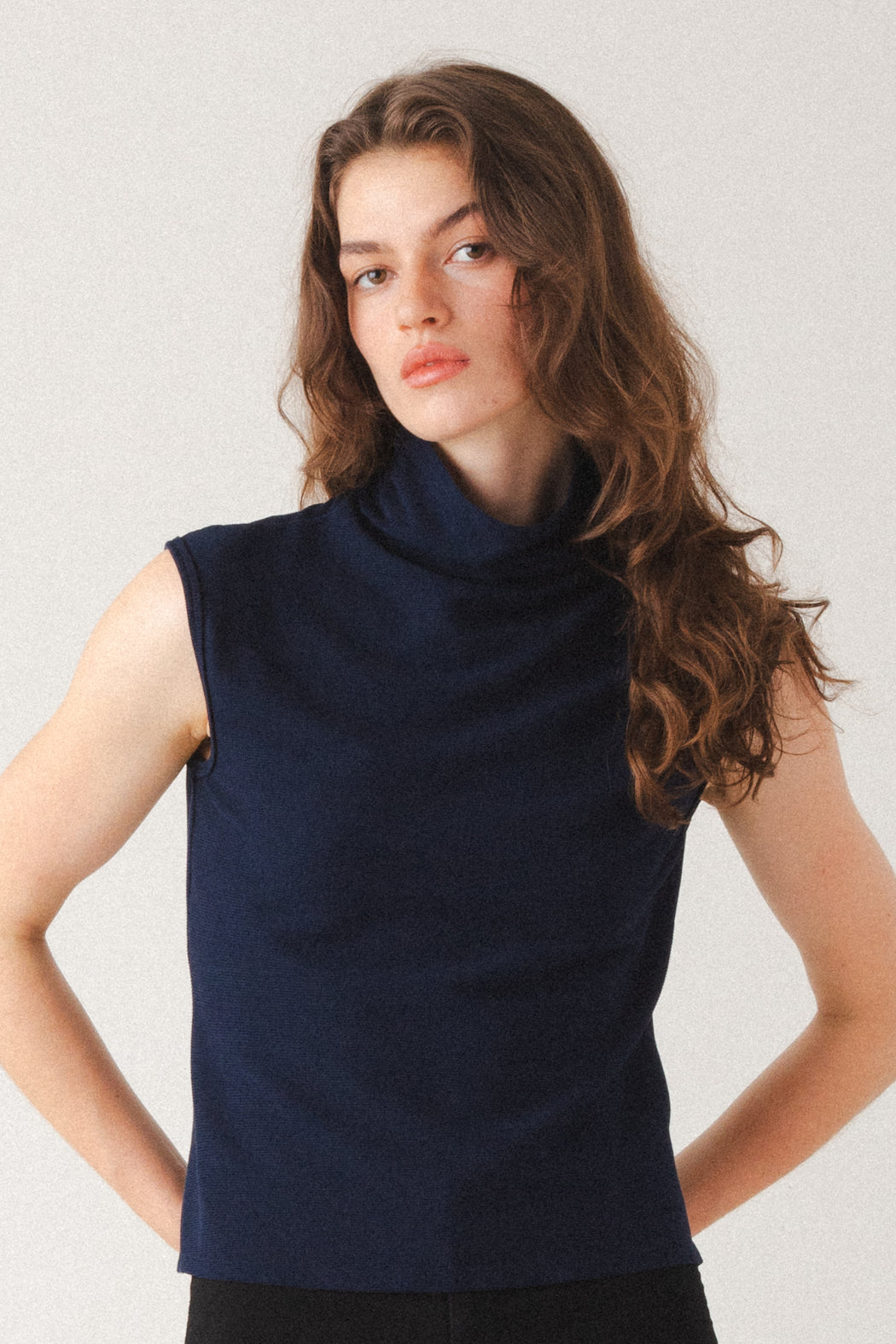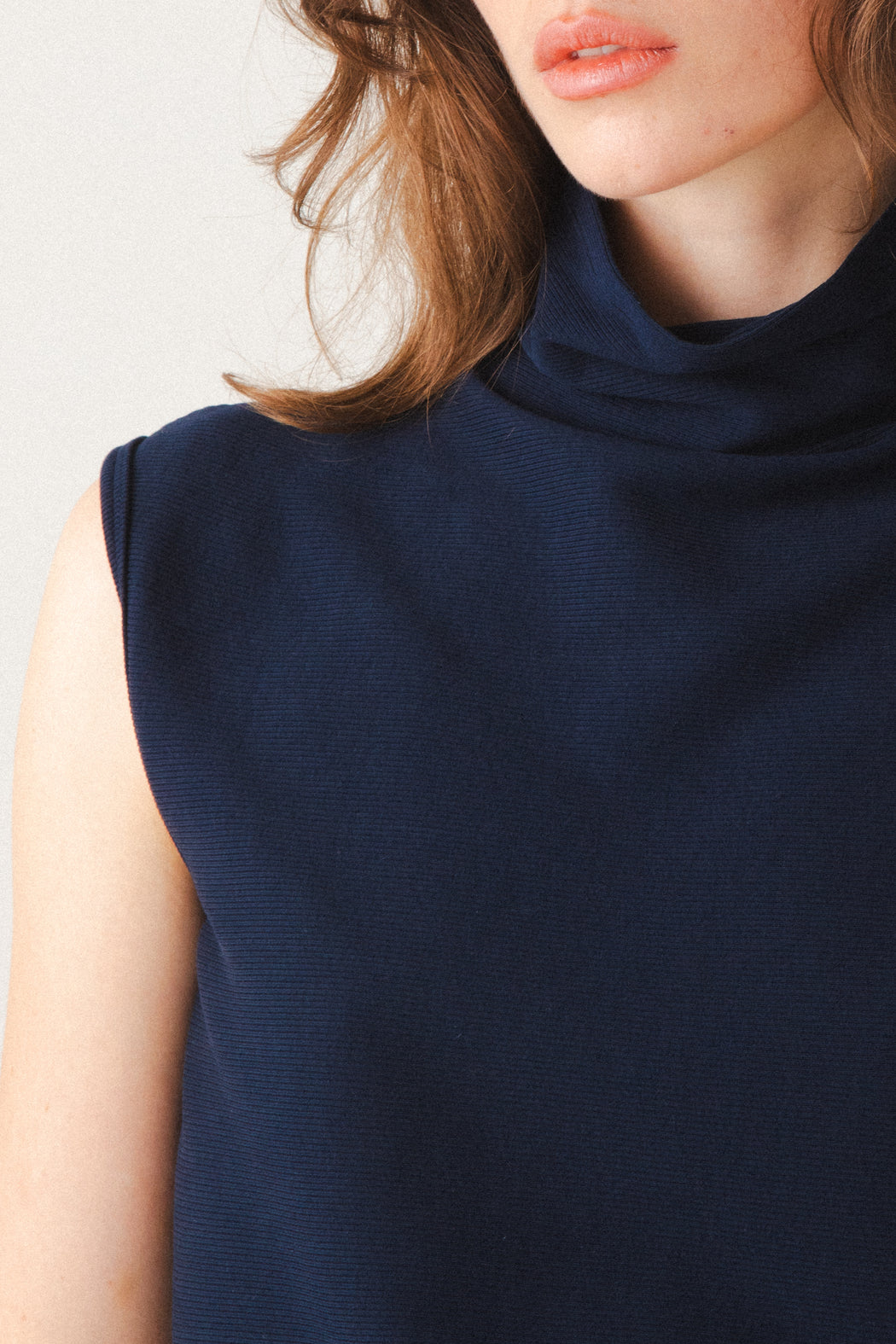 – Sleeveless slouchy funnel neck with clean modern lines