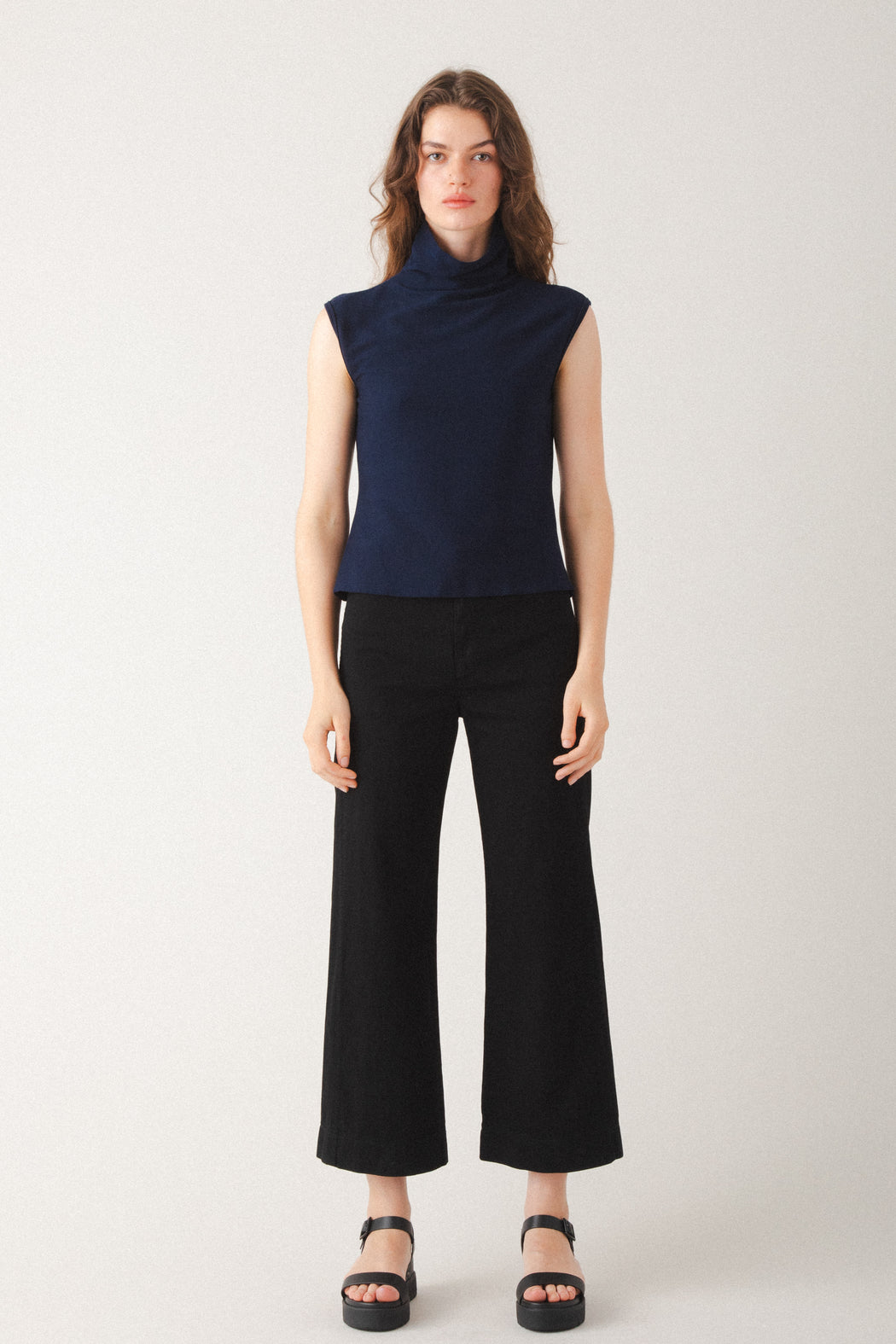 A modern update to our classic sleeveless mock-neck. The Soft Edge features a slouchy relaxed funnel neck and abbreviated cap sleeve, striking a balance between minimalism and edge. Made in an organic cotton/spandex blend, it offers a close but comfortable fit that works beautifully as a layering piece or worn solo.