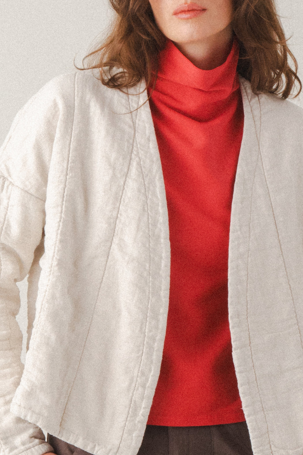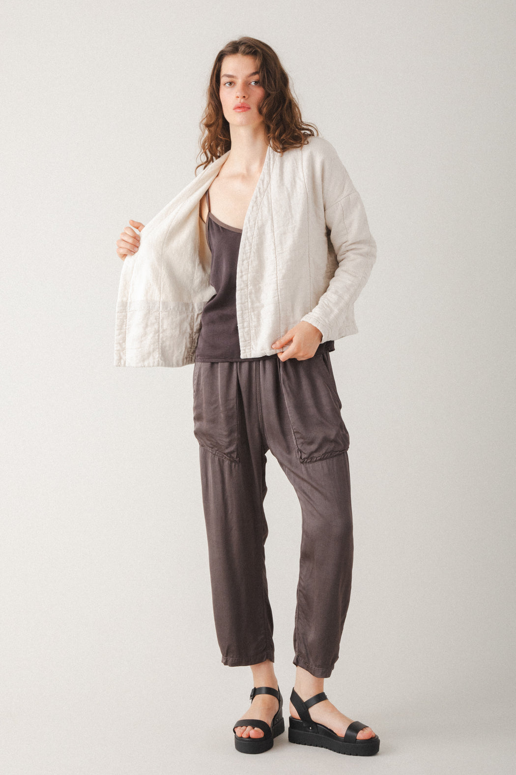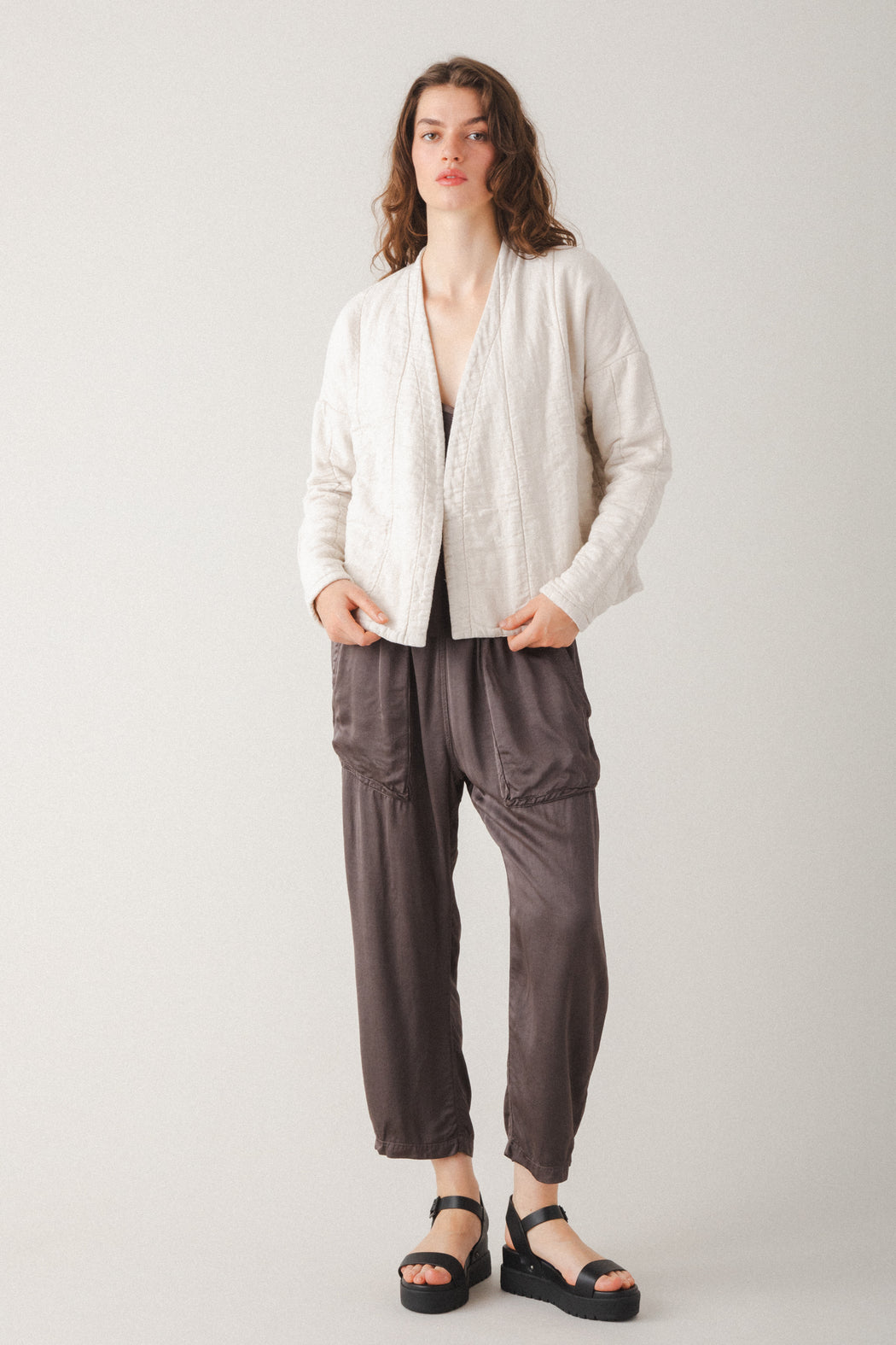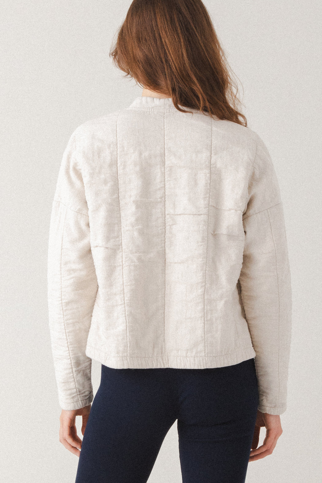 The Topo Jacket, reimagined. Originally released in 2020, this updated version is crafted in a soft hemp/cotton herringbone and feels like wrapping yourself in a cloud duvet. We quilted two complementary fabrics together to create texture, structure, and cozy warmth. Designed with slim, full-length sleeves and a relaxed, open-front silhouette, it features six hidden interior pockets for a clean, ultra-functional finish. An elevated cardigan-meets-jacket, perfect for staying warm at work, heading out to dinner, or settling in for a cozy movie night at home.