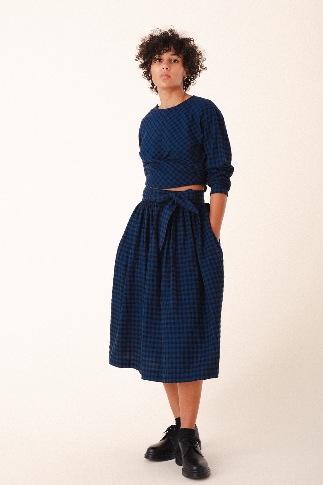 A 50s-inspired flannel wrap blouse with a modern feeling. Whether worn with full skirts or a twill jogger the look is effortless, impactful, and warm. An easy pullover blouse that instantly sharpens any ensemble with the powerful graphic impact of our deadstock flannels.