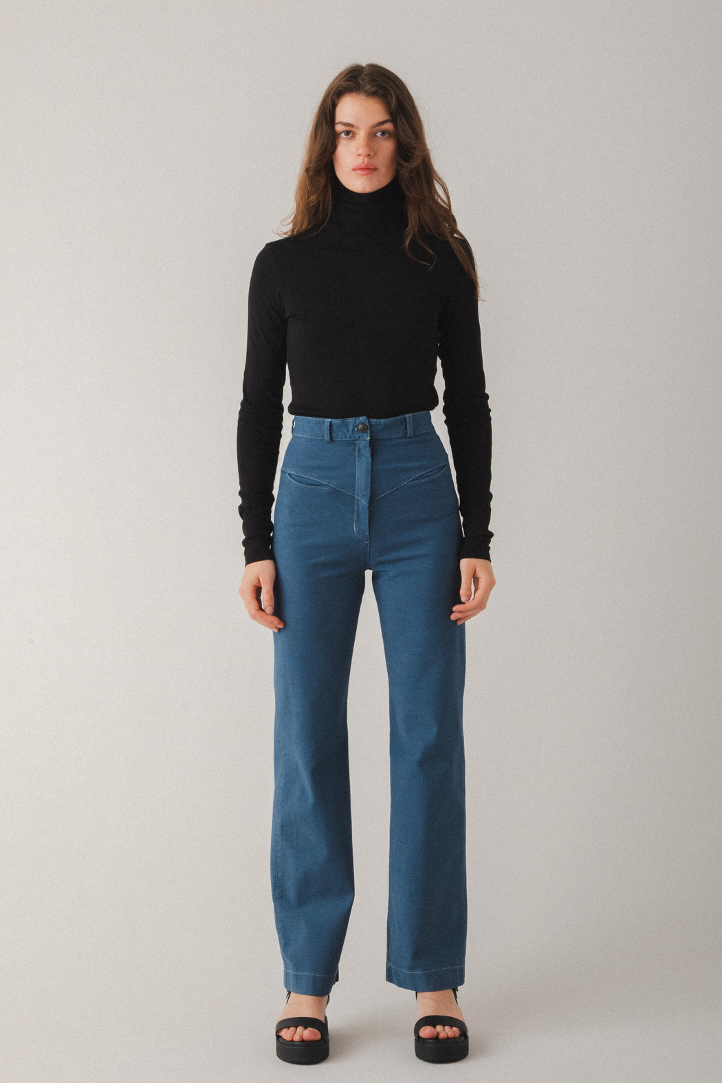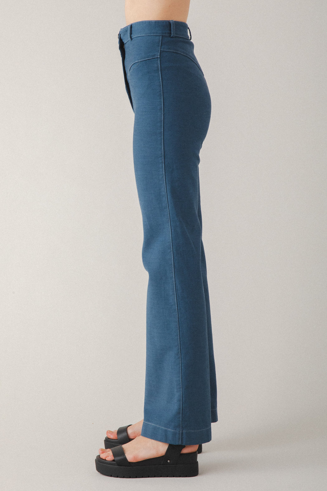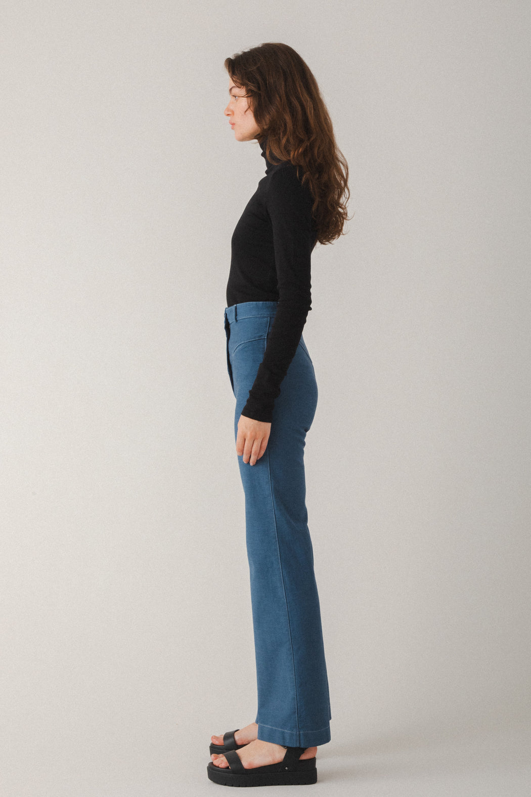 Returning to glam inspired silhouettes generally turns us on and makes us feel powerful. This 70’s inspired flare has a high rise and average length inseam. Two oval shaped front pockets, a simple yoked back and contrast top-stitch throughout.