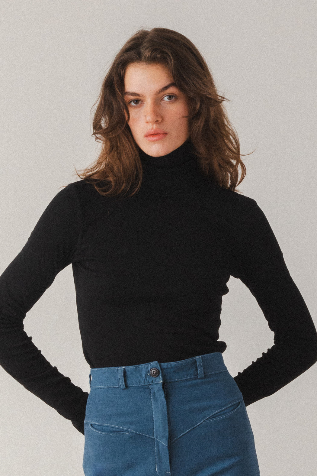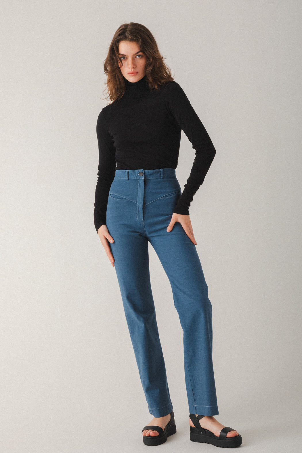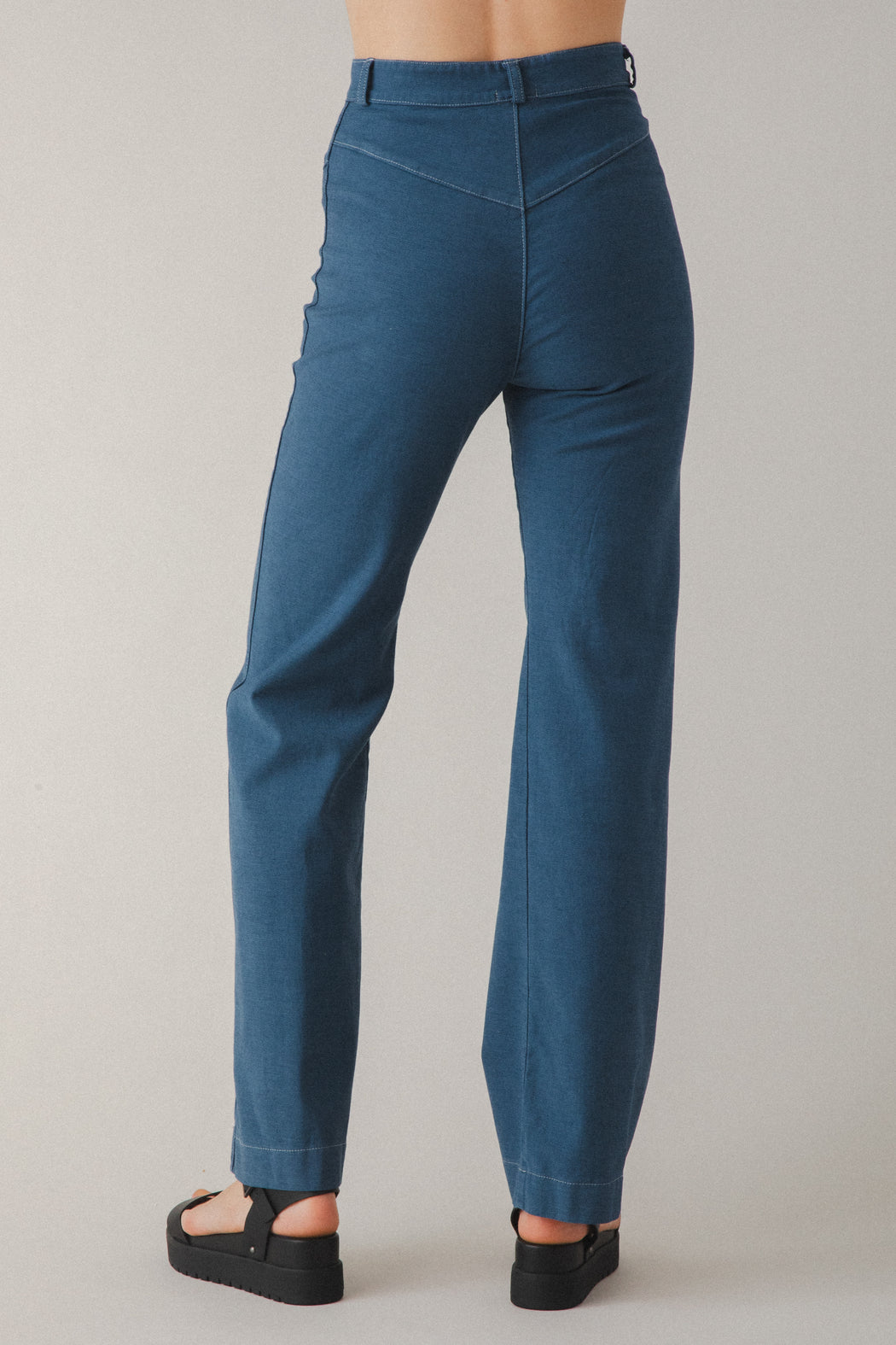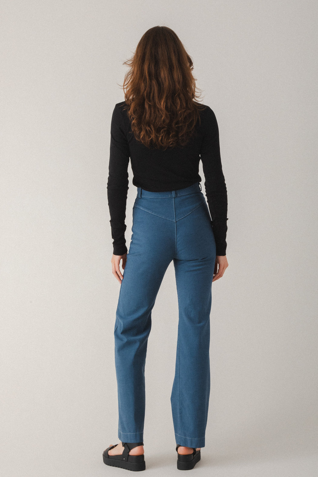 Returning to glam inspired silhouettes generally turns us on and makes us feel powerful. This 70’s inspired flare has a high rise and average length inseam. Two oval shaped front pockets, a simple yoked back and contrast top-stitch throughout.